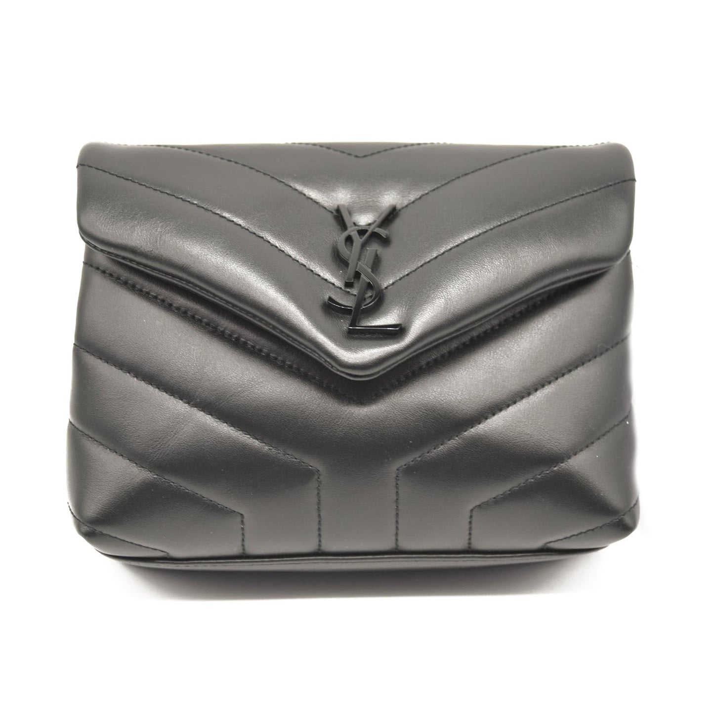 This is an authentic SAINT LAURENT Calfskin Y Quilted Monogram Monochrome Toy Loulou Crossbody Bag in Black. This chic crossbody bag is crafted of chevron-quilted calfskin leather in black. The bag features an adjustable shoulder strap and black hardware. The crossover flap opens to a partitioned black fabric interior with card slots and a zipper pocket.
