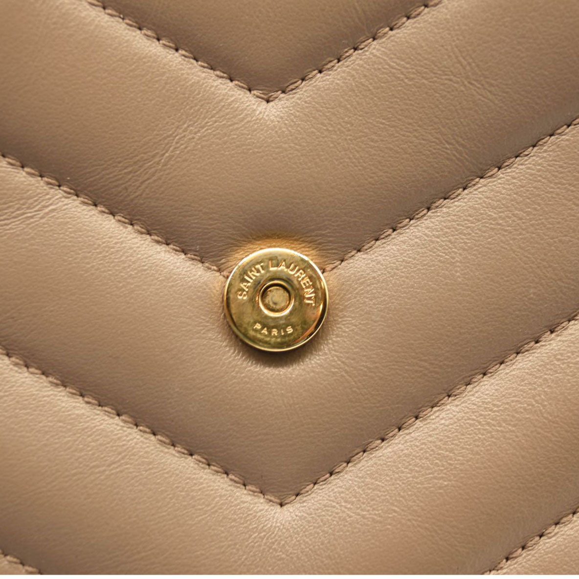 This is an authentic SAINT LAURENT Calfskin Y Quilted Monogram Toy Loulou Crossbody Bag in Latte. This elegant shoulder bag is crafted of chic chevron quilted calfskin leather in beige. The bag features a leather shoulder strap and gold hardware. The front flap features a prominent gold YSL monogram detail and opens to a partitioned black fabric interior with zipper and patch pockets.