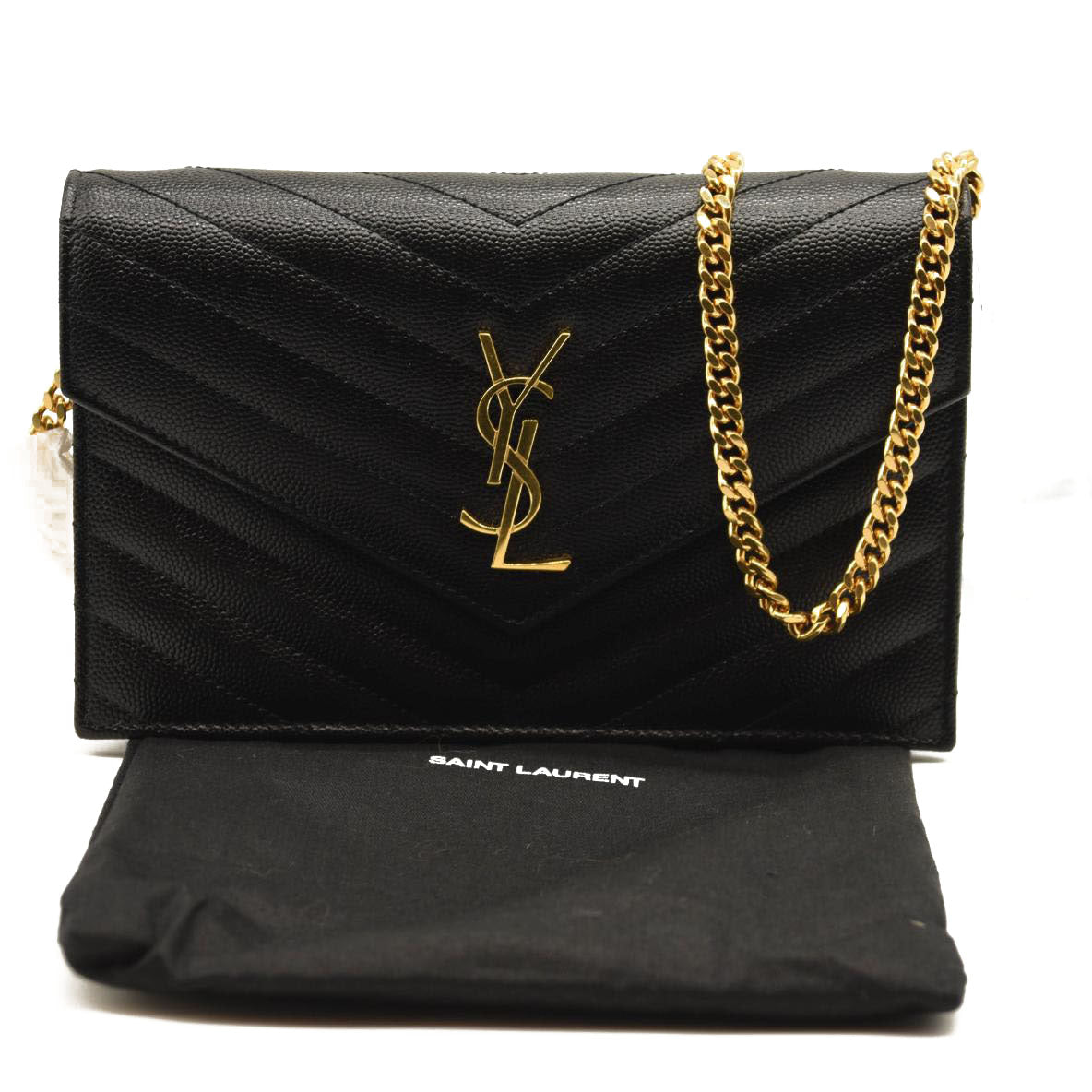 This is an authentic SAINT LAURENT Grain De Poudre Matelasse Chevron Monogram Chain Wallet in Black. This elegant wallet on a chain is crafted of finely pebbled chevron quilted leather in black. The shoulder bag features a removable waist-length bijoux gold chain shoulder strap with a shoulder pad and a gold classic YSL emblem on the flap. This opens to a black leather interior with card slots, a zipper compartment, and a pocket.
