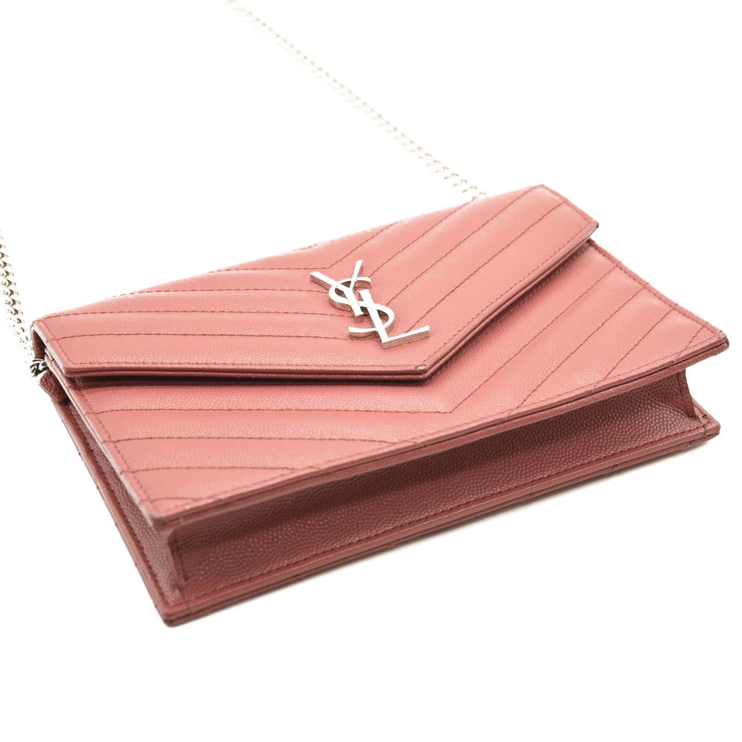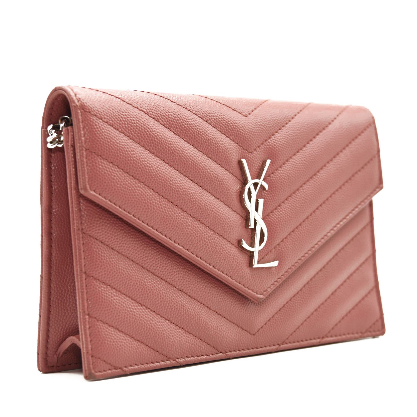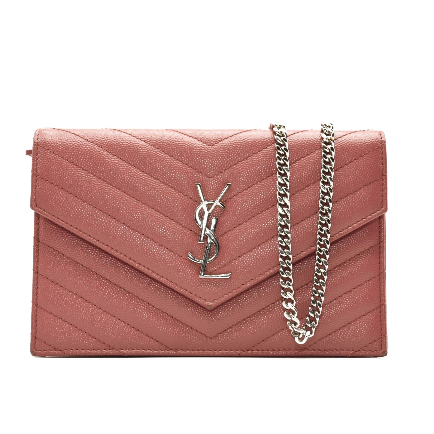This is an authentic SAINT LAURENT Grain De Poudre Matelasse Chevron Monogram Chain Wallet in Mystic Rose. This elegant chain wallet features fine pebbled chevron quilted leather in pink. This shoulder bag features a polished silver chain link shoulder strap and a facing V-shaped flap with a prominent silver YSL logo. The flap opens with a silver button snap to a partitioned black leather interior with a central zipper pocket, card slot panels, and patch pockets. This bag has room for daytime or evening essentials with the classic chic of Saint Laurent!
