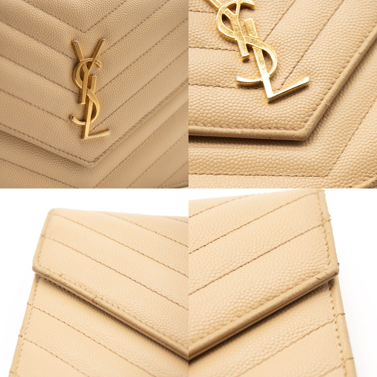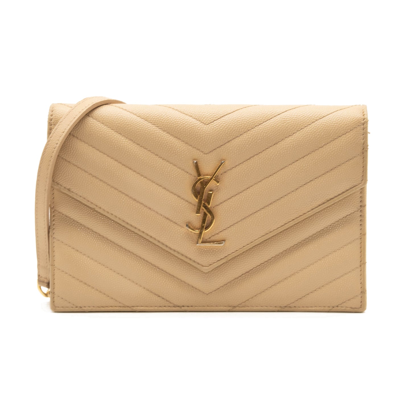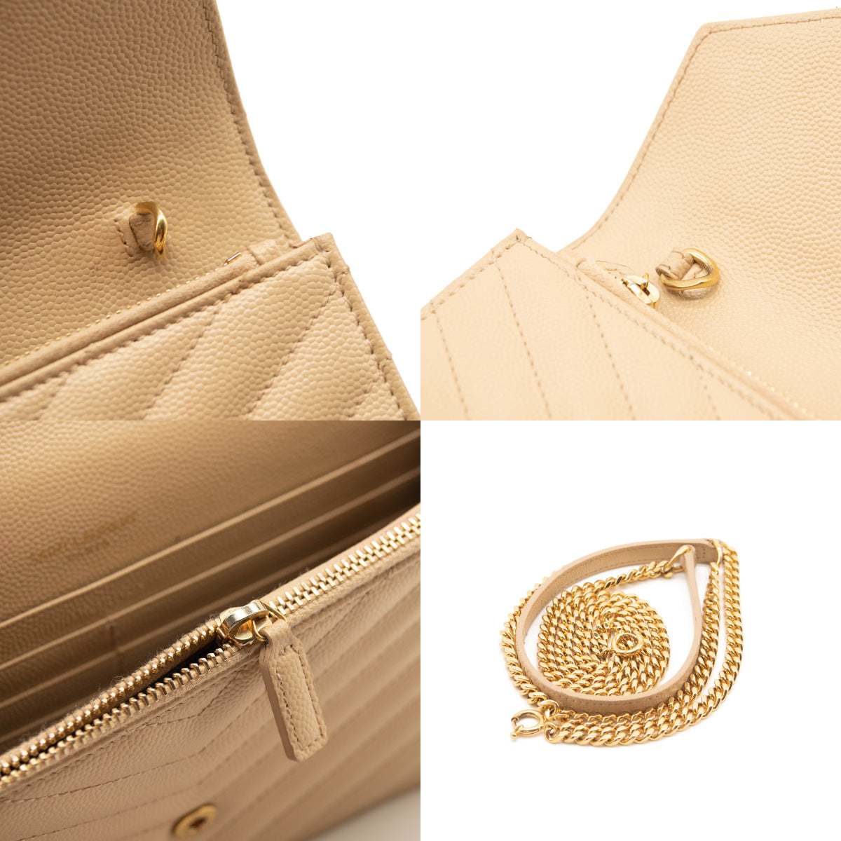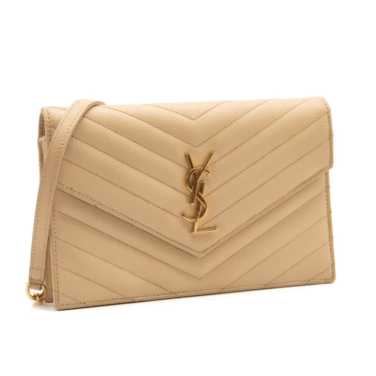 SAINT LAURENT Grain De Poudre Matelasse Chevron Monogram Envelope Chain Wallet Beige