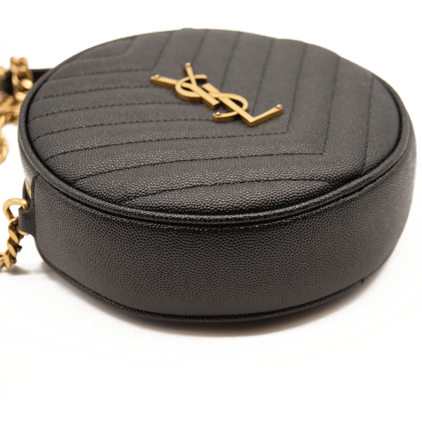 This is an authentic SAINT LAURENT Grain De Poudre Matelasse Chevron Quilted Round Vinyle Camera Bag in Black. This elegant circular crossbody features a chic chevron quilting in textured leather. The bag features a bijoux aged gold chain-link shoulder strap, top zipper, and a facing prominent YSL monogram logo. The zipper opens to a black fabric interior with a patch pocket.