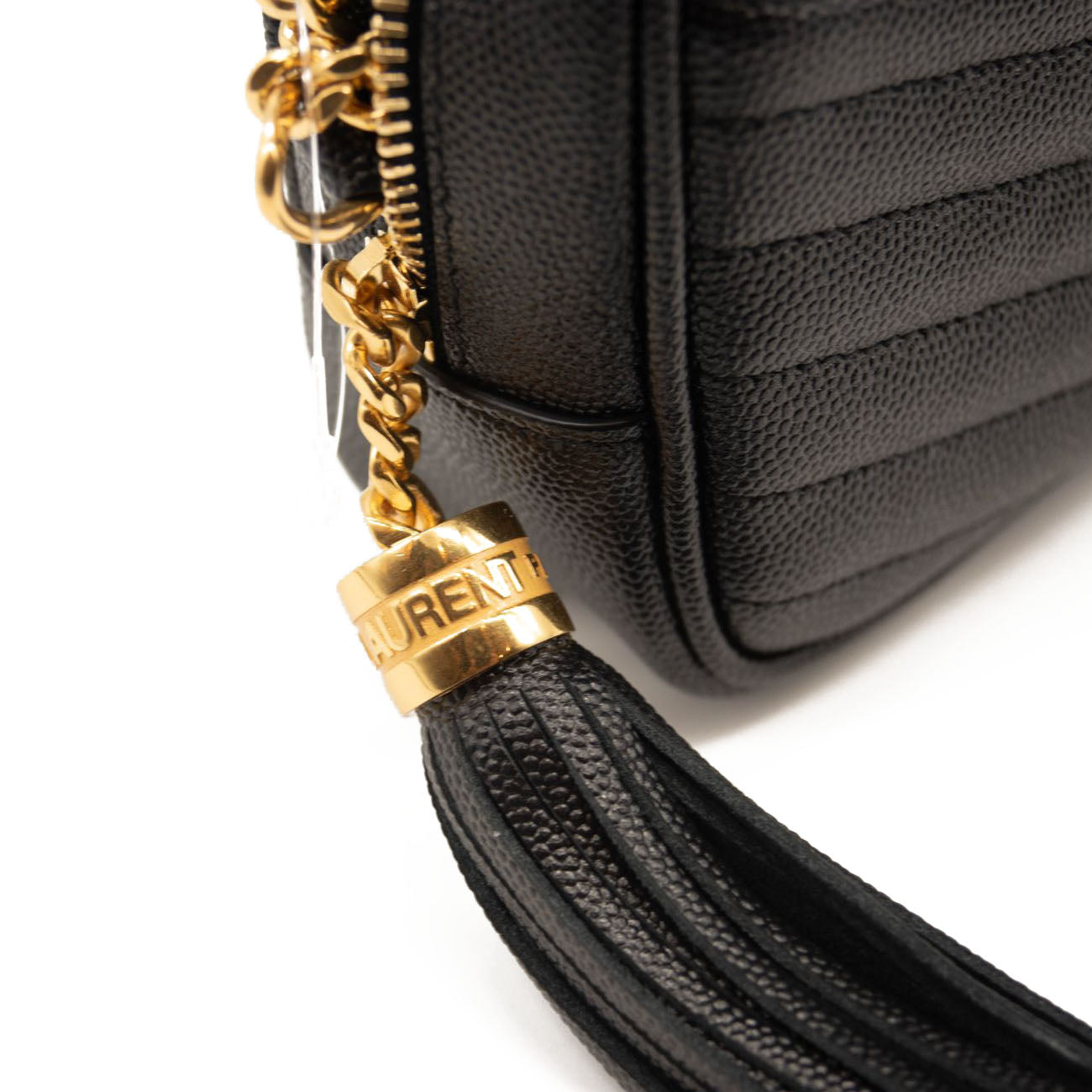 This is an authentic SAINT LAURENT Grain De Poudre Matelasse Monogram Mini Lou Camera Bag in Black. This shoulder bag is crafted of chevron-quilted calfskin leather in black. The bag features a gold chain link shoulder strap, and a matching gold YSL monogram detail on the front. The tasseled wrap-around zipper opens to a compact black leather interior with card slots.