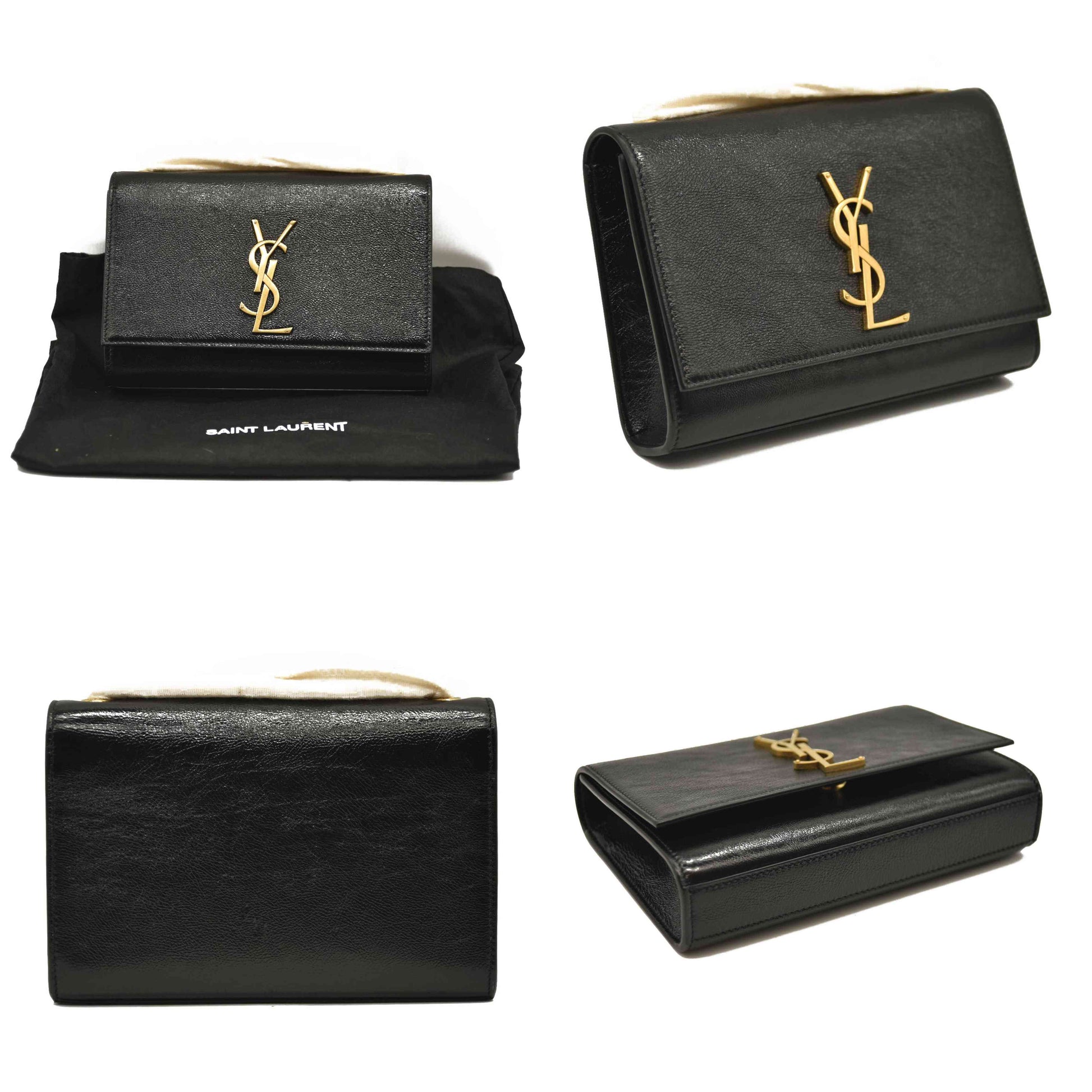 This is an authentic SAINT LAURENT Grain De Poudre Medium Classic Monogram Kate Satchel in Black. This stylish shoulder bag is crafted of black textured leather. The bag features a gold chain-link shoulder strap with a gold YSL logo on the face. The flap opens to a black fabric interior with a patch pocket.