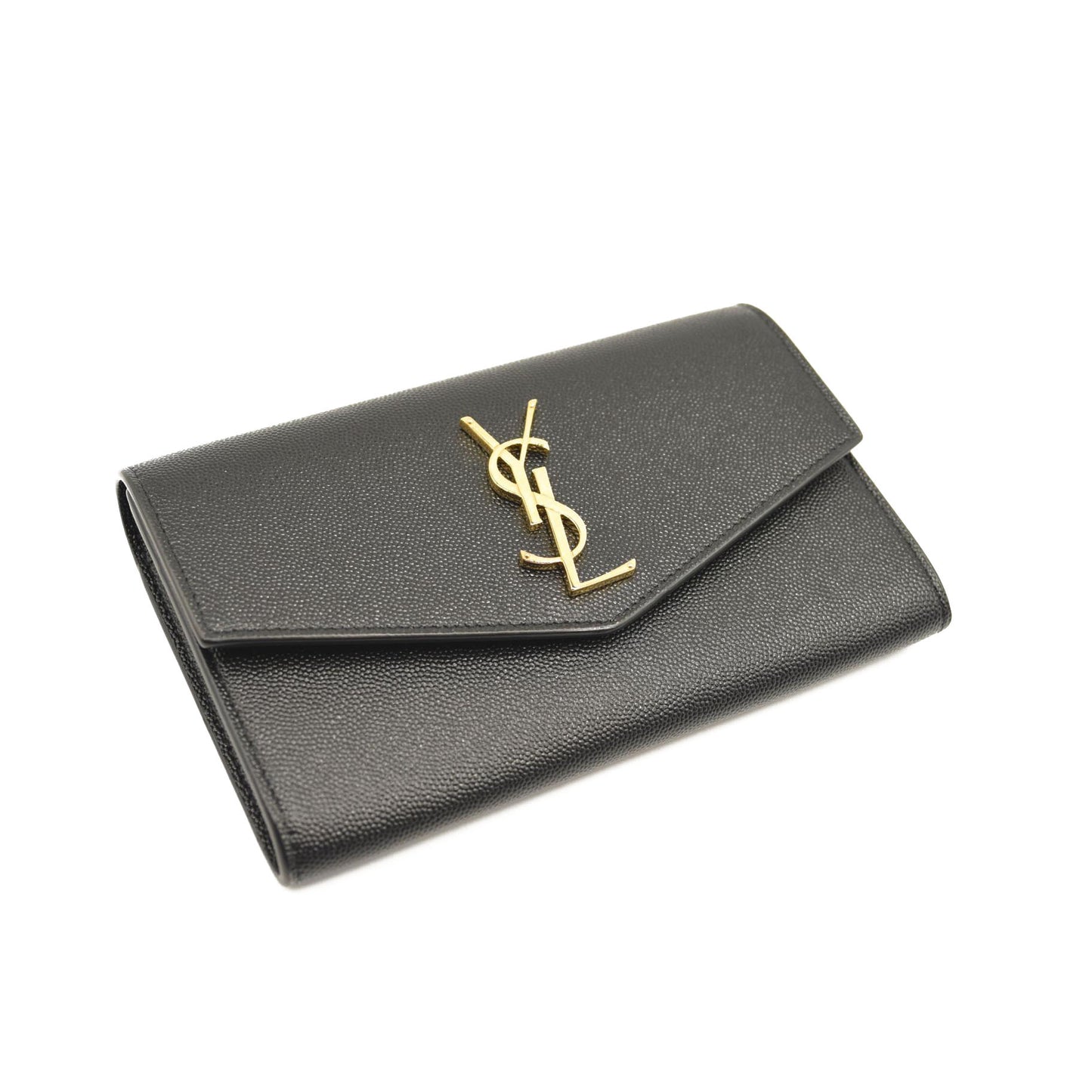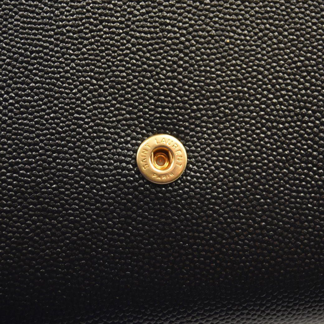 This is an authentic SAINT LAURENT Grain De Poudre Uptown Chain Wallet in Black. This tote is crafted of pebbled calfskin leather in black. The bag features an optional polished gold chain strap and a matching gold YSL monogram detail on the crossover flap. The bag opens to a partitioned black leather interior with patch pockets.