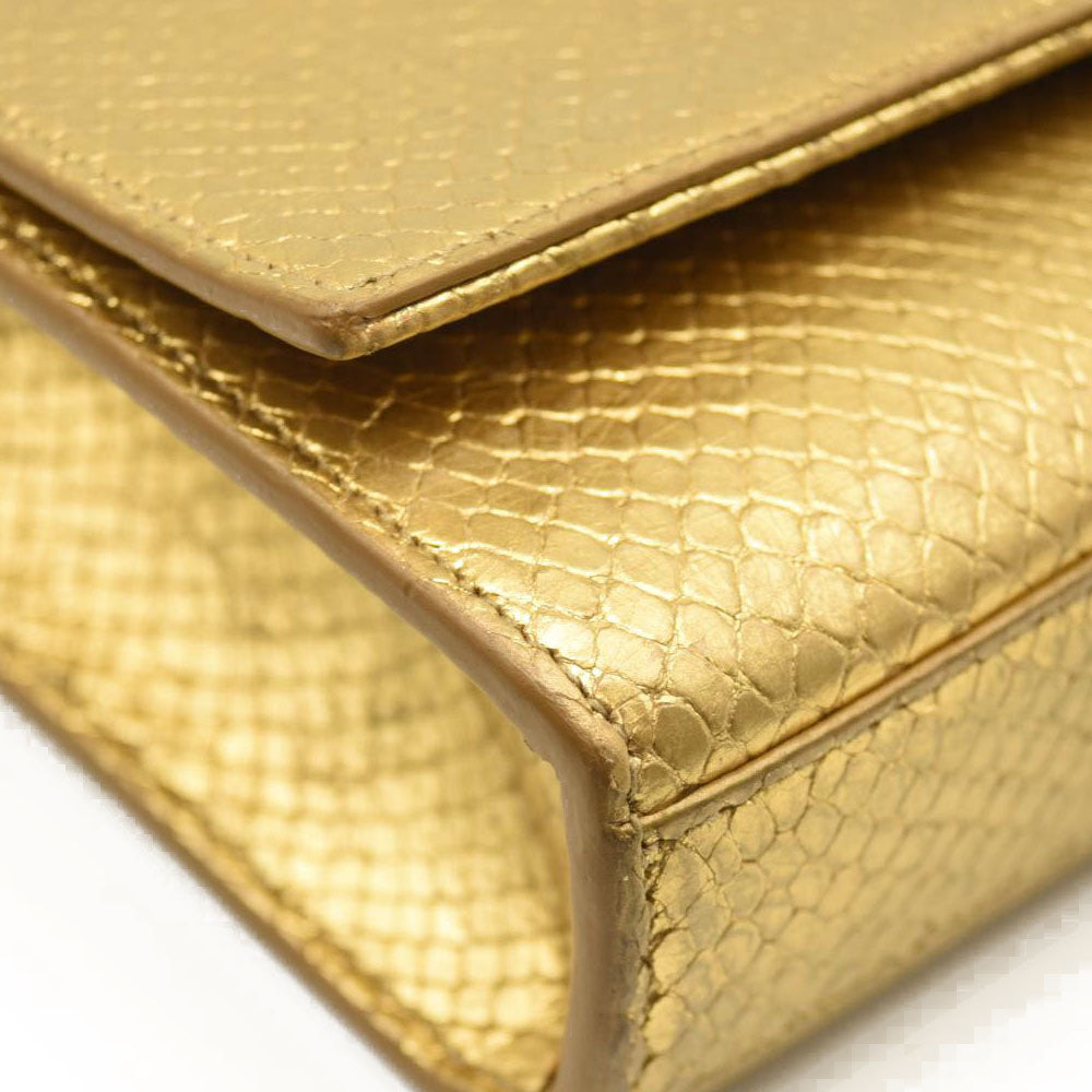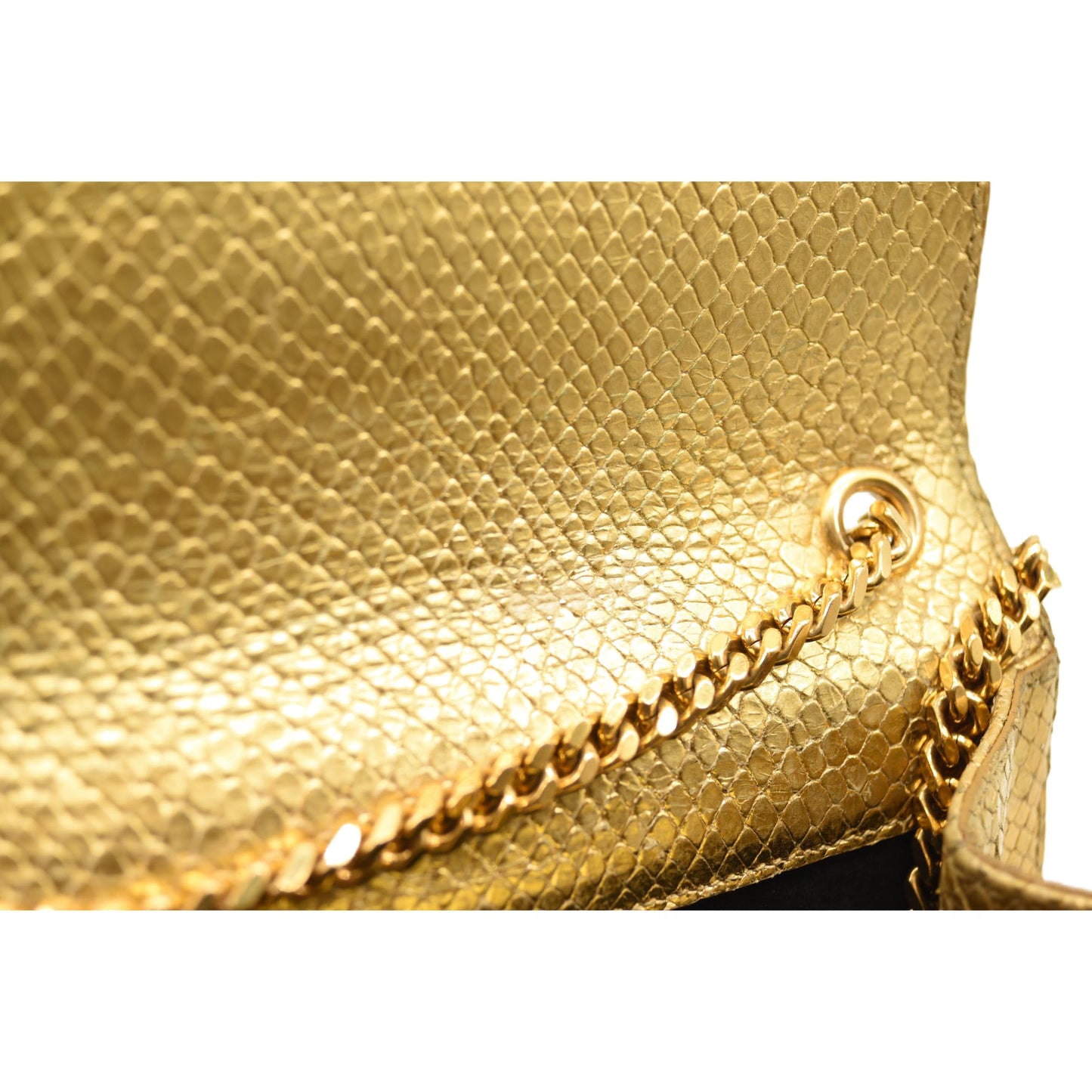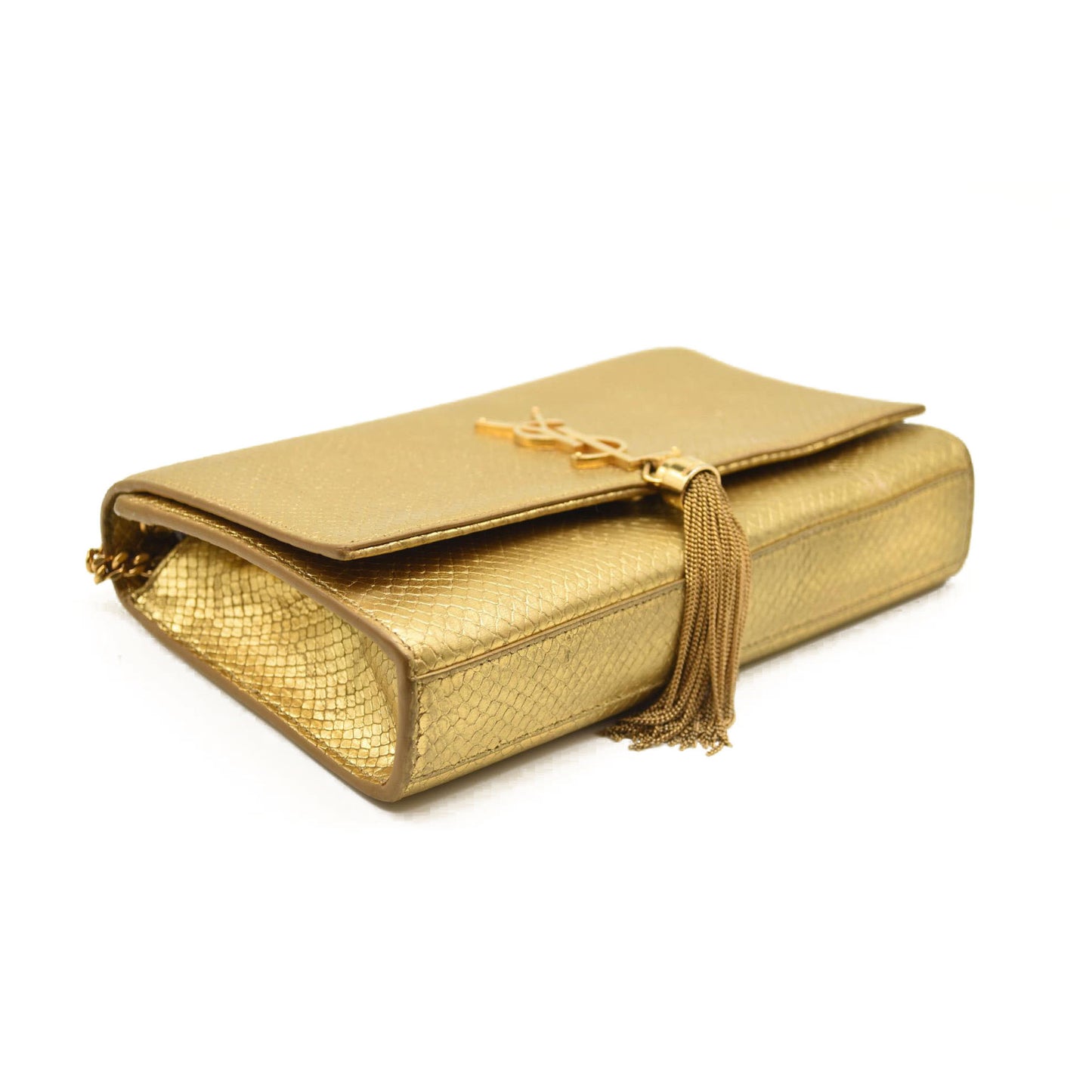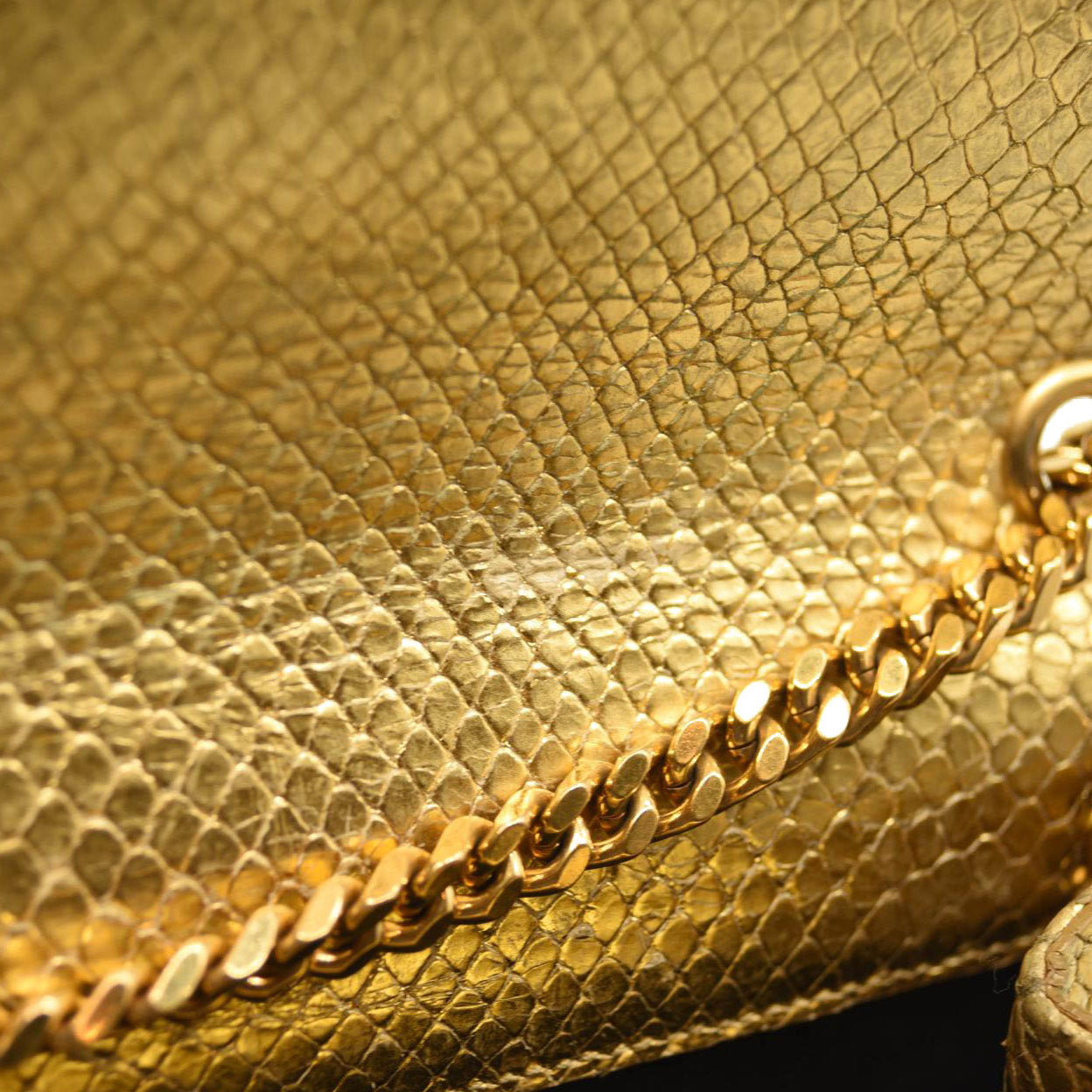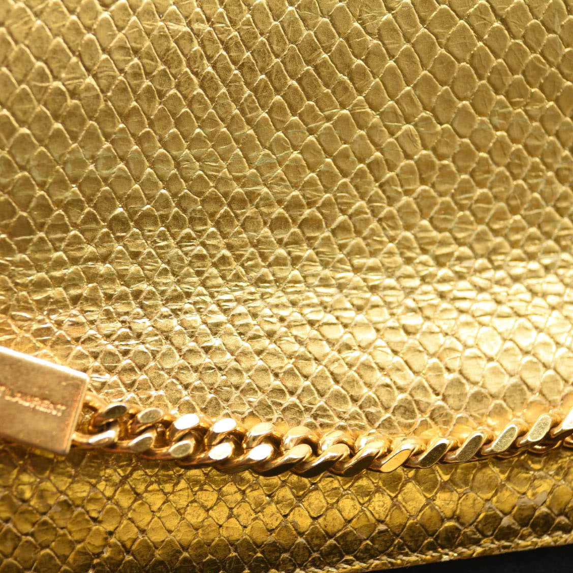 This is an authentic SAINT LAURENT Metallic Python Embossed Medium Classic Monogram Kate Tassel Satchel Gold. This elegant chain wallet features python embossed calfskin leather in gold. The bag features gold chain link shoulder strap and a facing flap with a prominent gold YSL logo signature. The flap opens to a suede black interior with a single card slot.