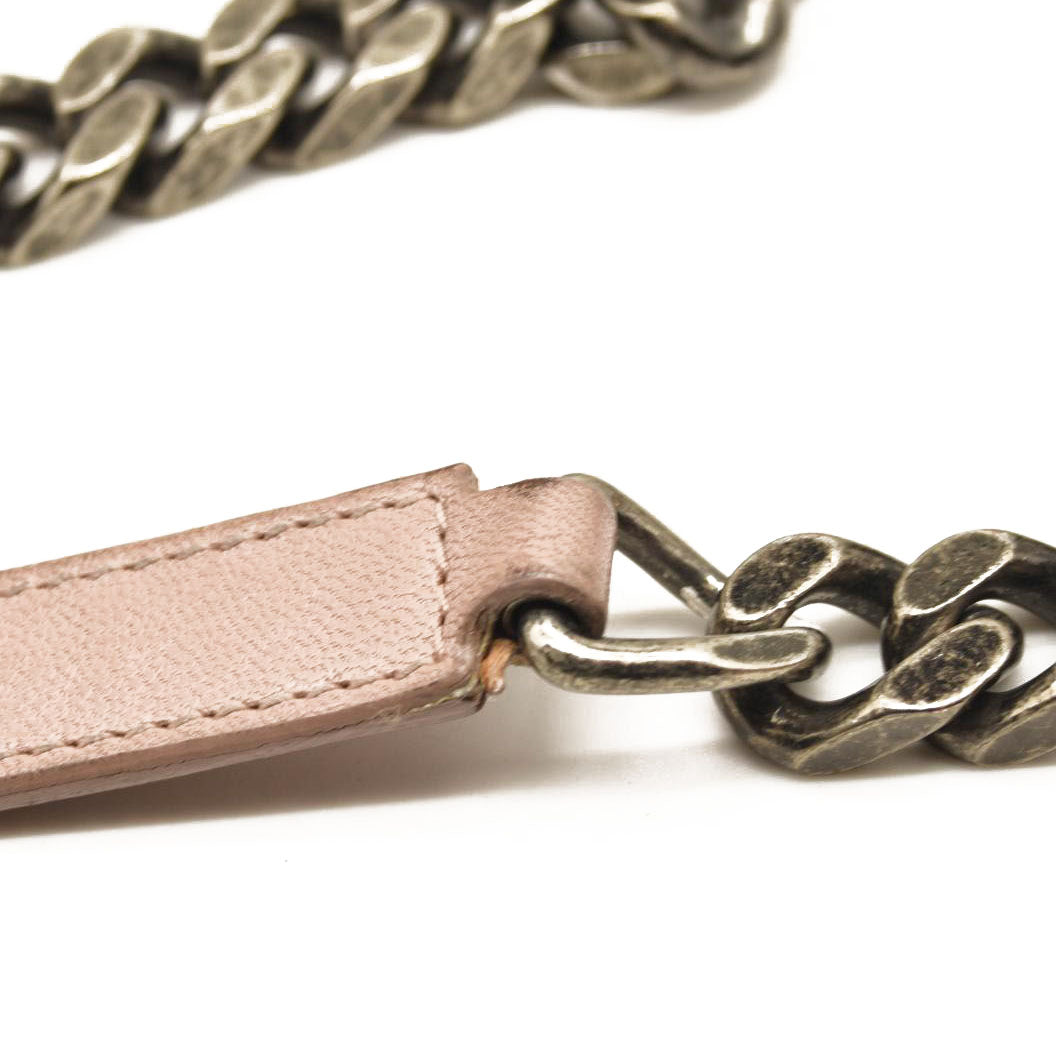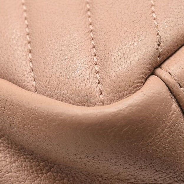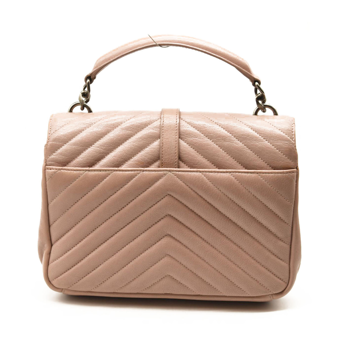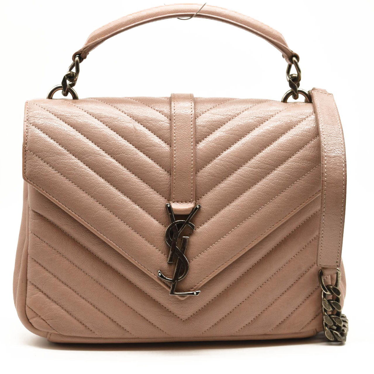 This is an authentic SAINT LAURENT Sheepskin Matelasse Chevron Monogram Medium College Bag in Rose Poudre. This elegant shoulder bag is crafted of chevron-quilted sheepskin leather in beige pink. The bag features a rear patch pocket, a sturdy leather top handle, and an optional aged silver chain-link shoulder strap with a shoulder pad. The crossover flap showcases a prominent aged silver YSL monogram detail and opens to a partitioned black fabric interior with zipper and patch pockets.