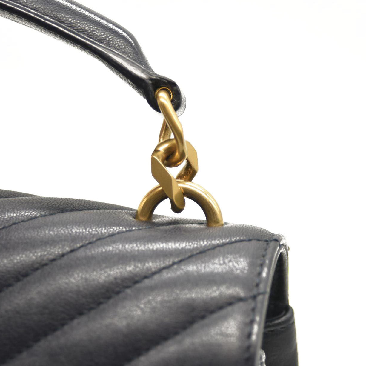 This is an authentic SAINT LAURENT Sheepskin Matelasse Monogram Medium College Bag in Navy. This elegant shoulder tote features chic chevron quilted sheepskin leather in medium blue. The bag features a leather top handle, an aged gold chain link shoulder strap with a leather shoulder pad and a prominent gold-tone YSL monogram detail closure. The flap opens to a partitioned fabric interior with a patch pocket and a central zippered pocket.