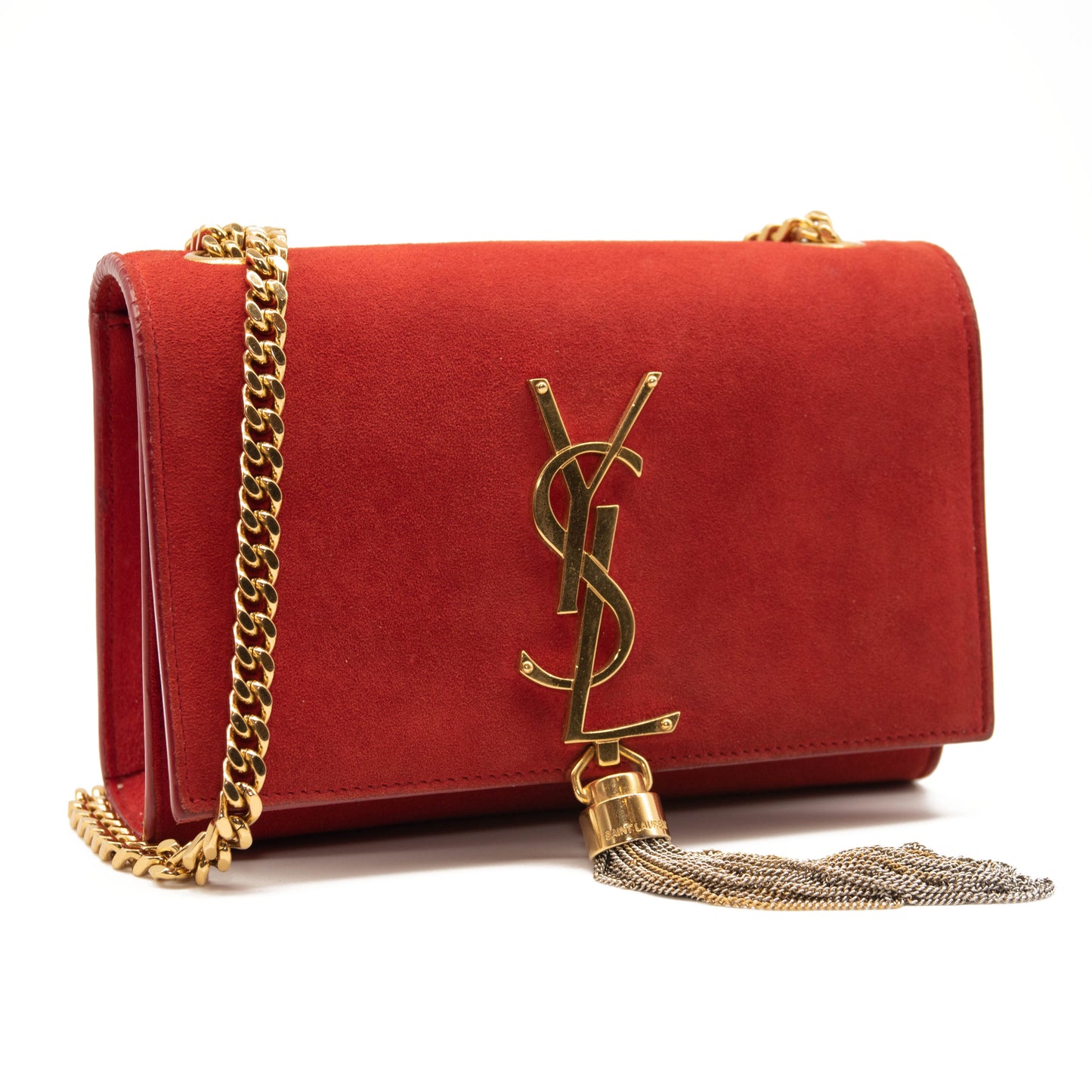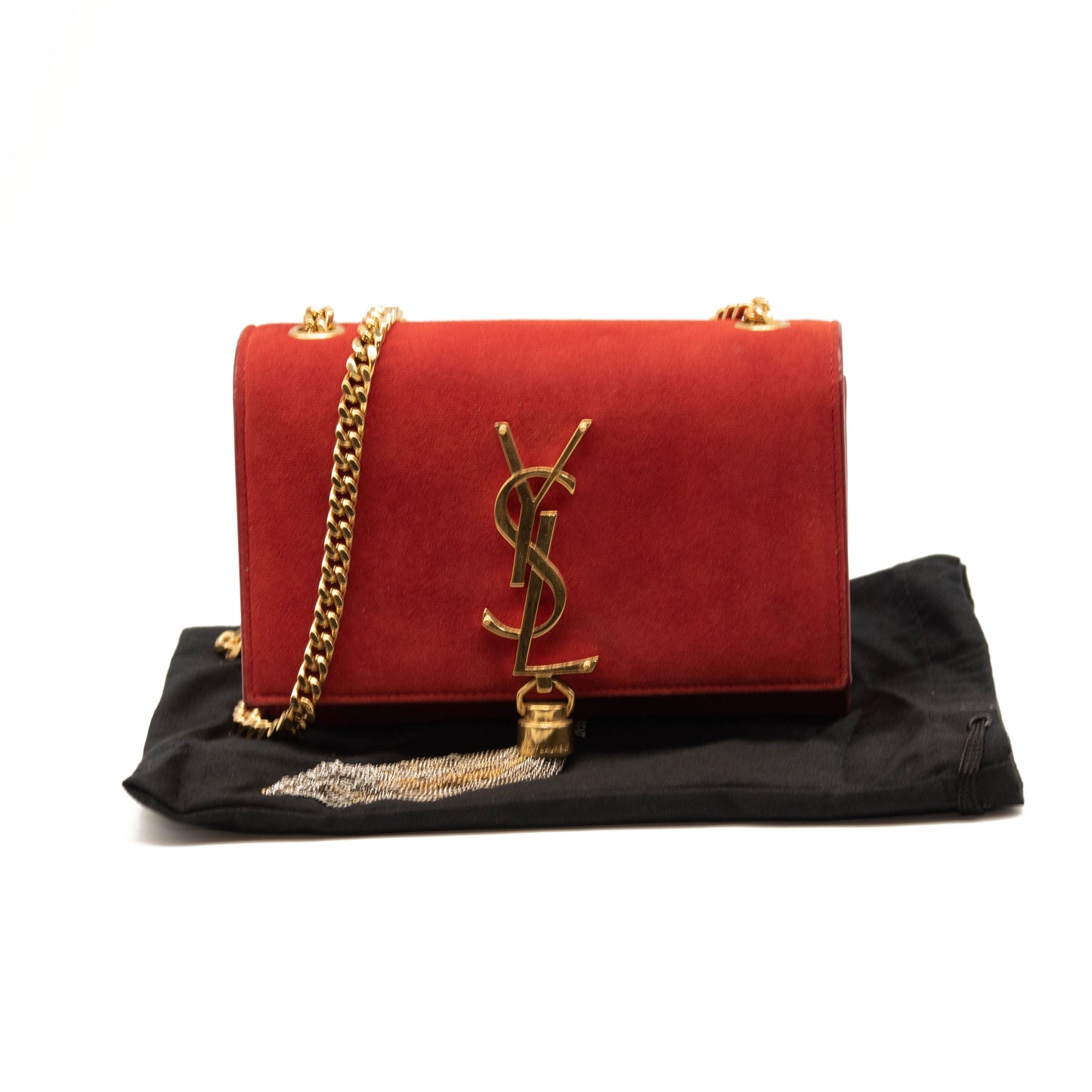 This is an authentic SAINT LAURENT Suede Small Classic Monogram Kate Tassel Satchel in Red. This stunning small shoulder bag is crafted of suede leather in red. The bag features a gold chain link cross-body shoulder strap and a facing flap with a gold YSL logo and a gold knobbed miniature gold chain tassel. The flap opens to a red leather interior ideal for daytime or evening wear only from Saint Laurent!