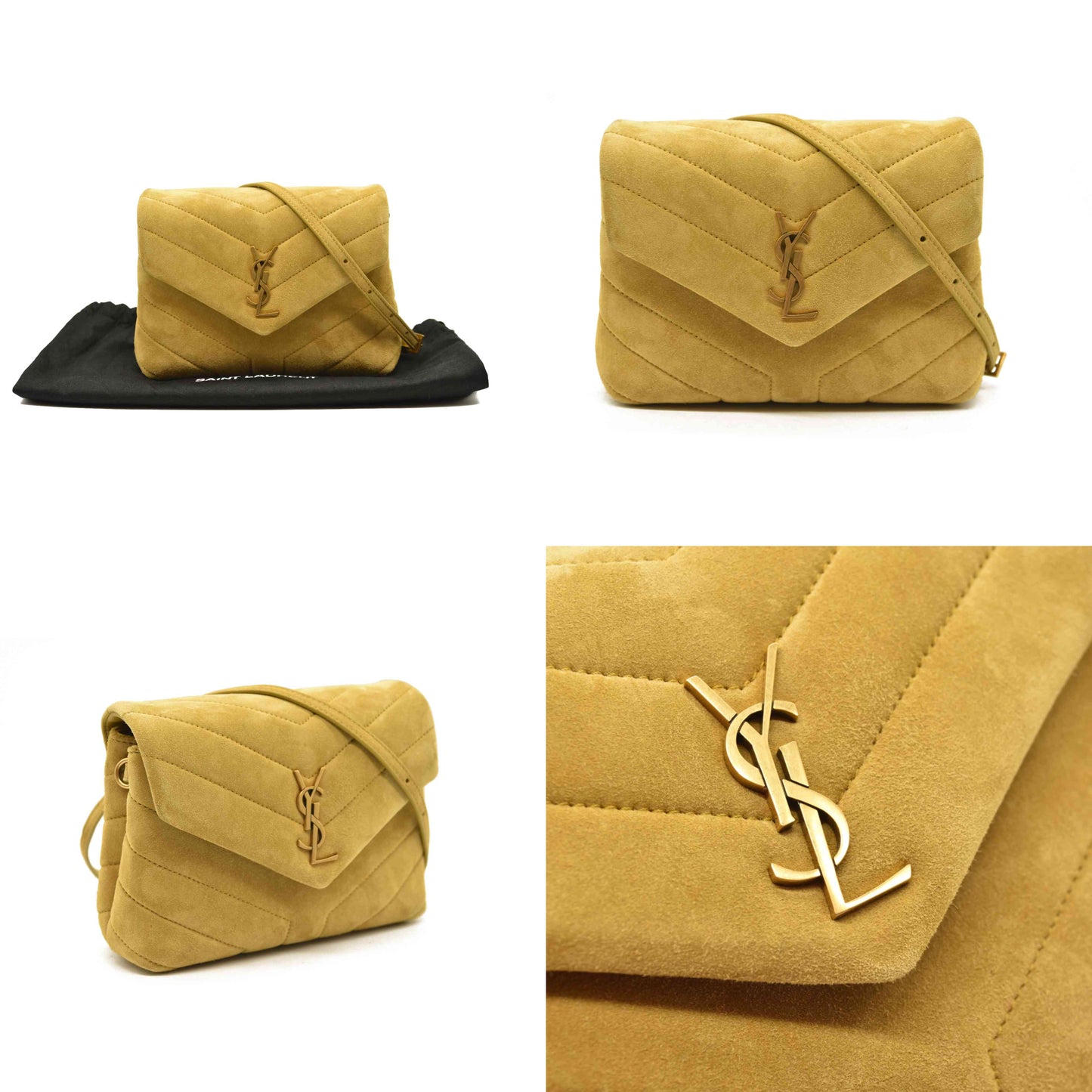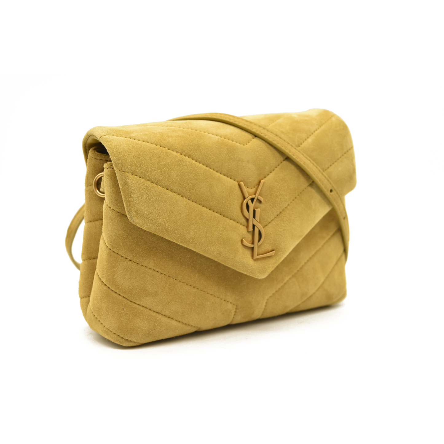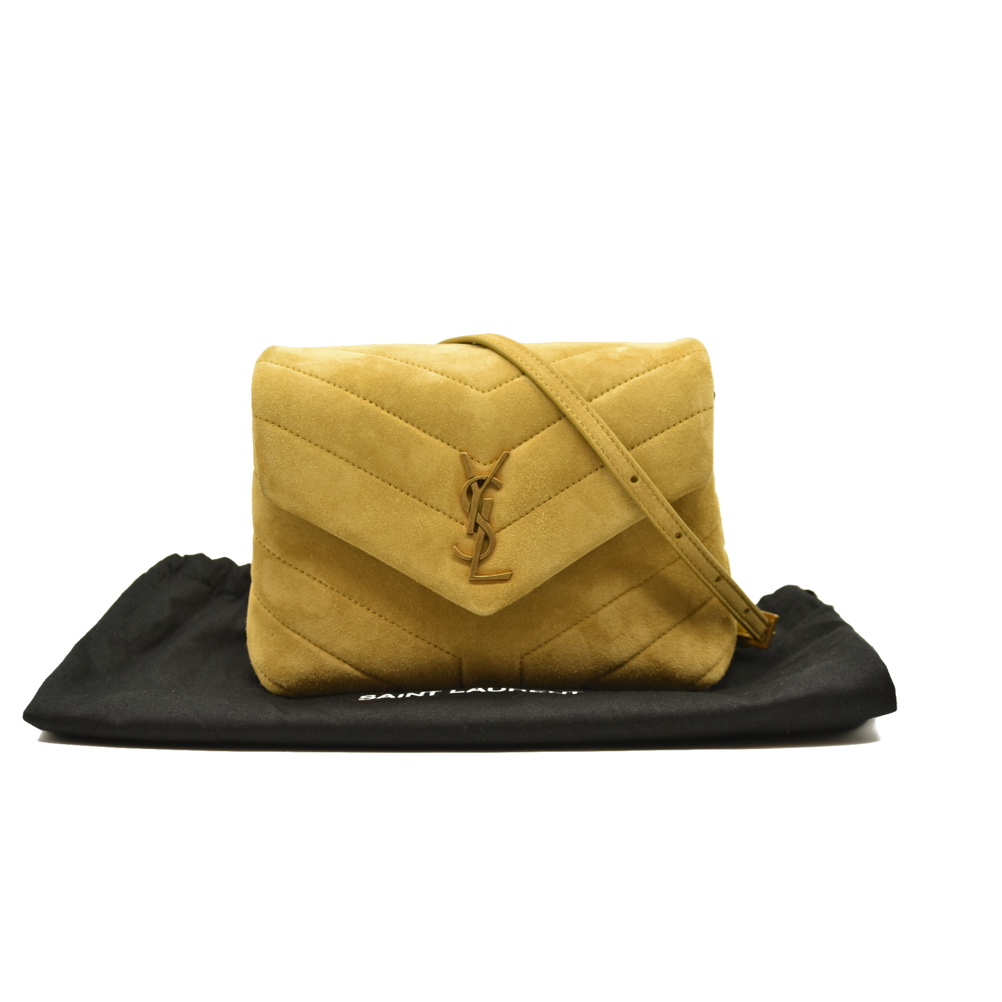 This is an authentic SAINT LAURENT Suede Toy Loulou Shoulder Bag in Chartreuse. This elegant bag is crafted out of yellow-green suede. The shoulder bag features an adjustable suede shoulder strap and gold hardware. The front flap has a prominent matching gold YSL monogram detail and opens to a partitioned black fabric interior with s zipper pocket and card slots.