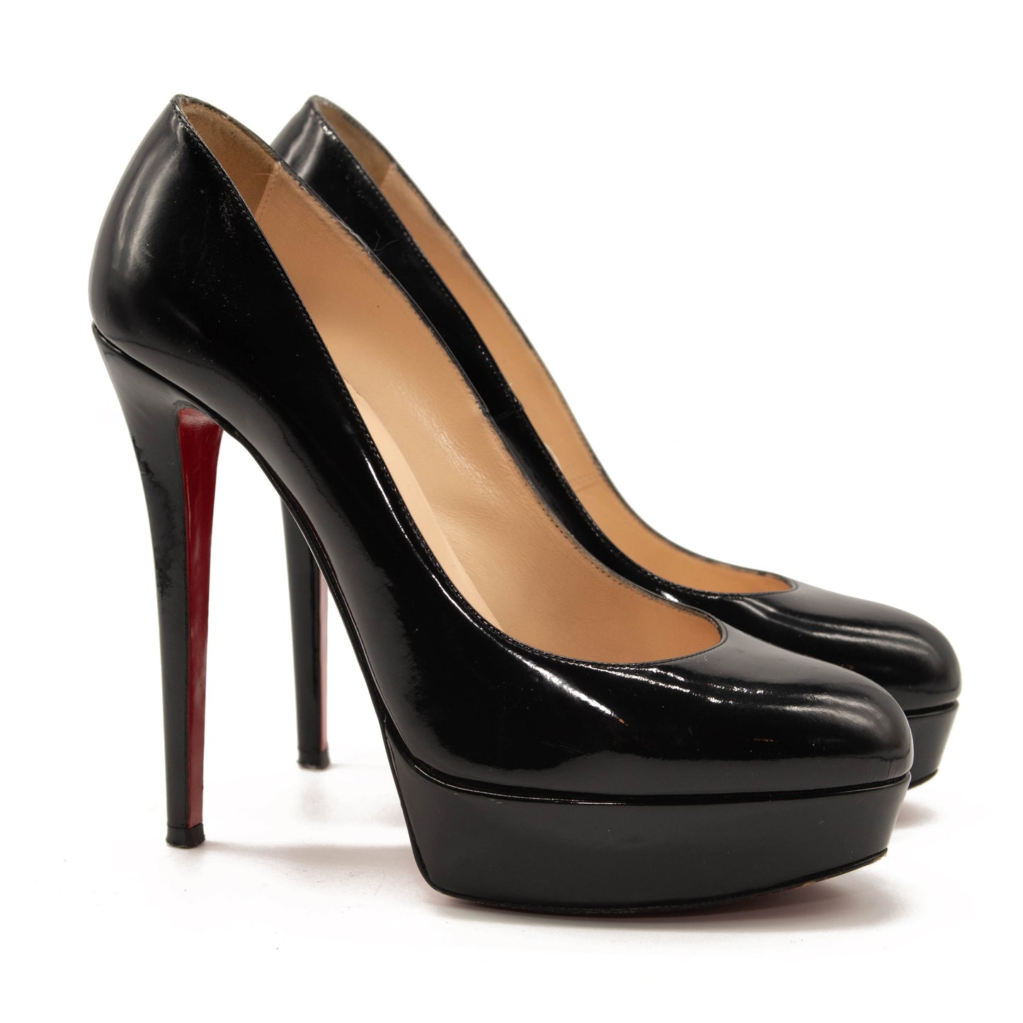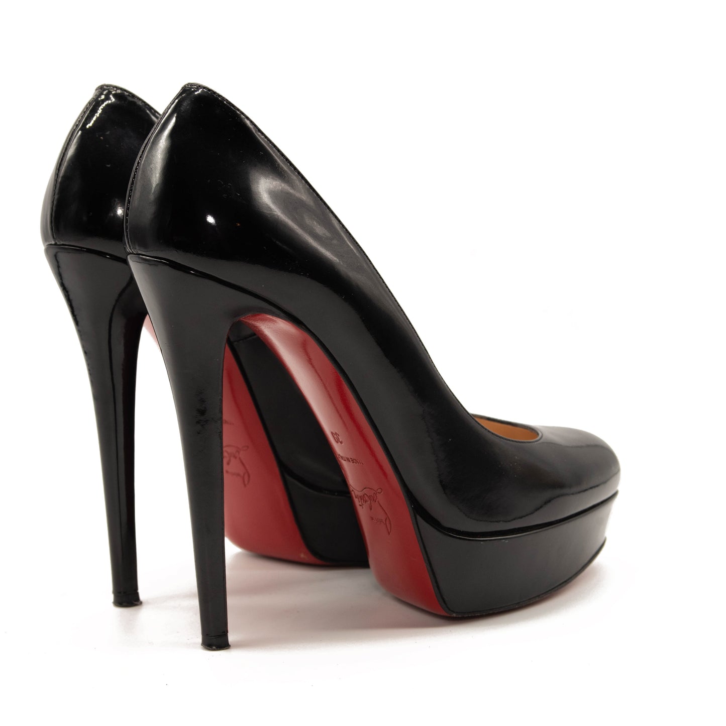 These are authentic CHRISTIAN LOUBOUTIN Patent Bianca 140 Pumps size 39 in Black. These stunning pumps are crafted of shiny patent leather in black. These feature a wrapped sharp 5.25-inch stiletto and a covered platform of an inch and a round toe. These are excellent pumps for the iconic look you find only from Christian Louboutin!