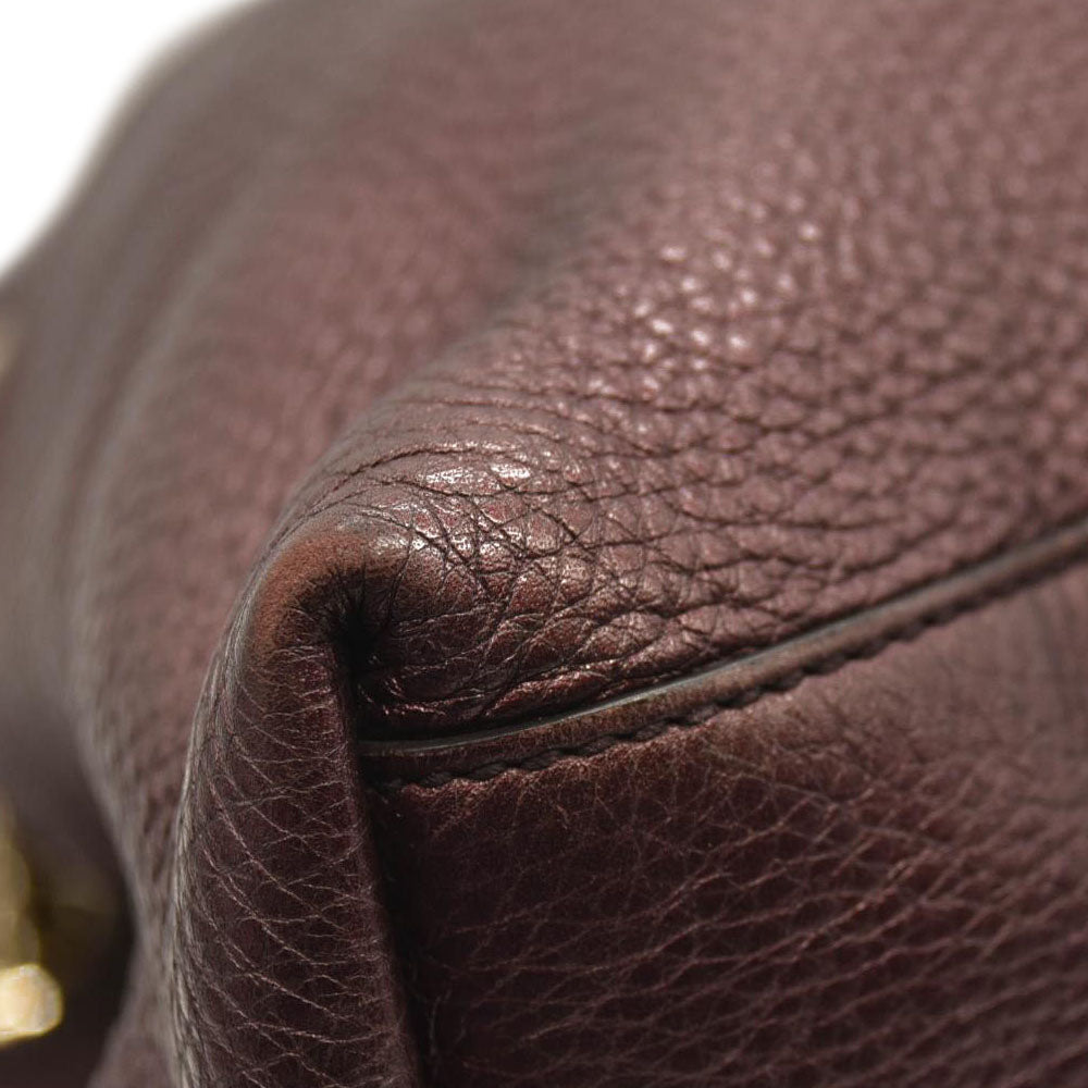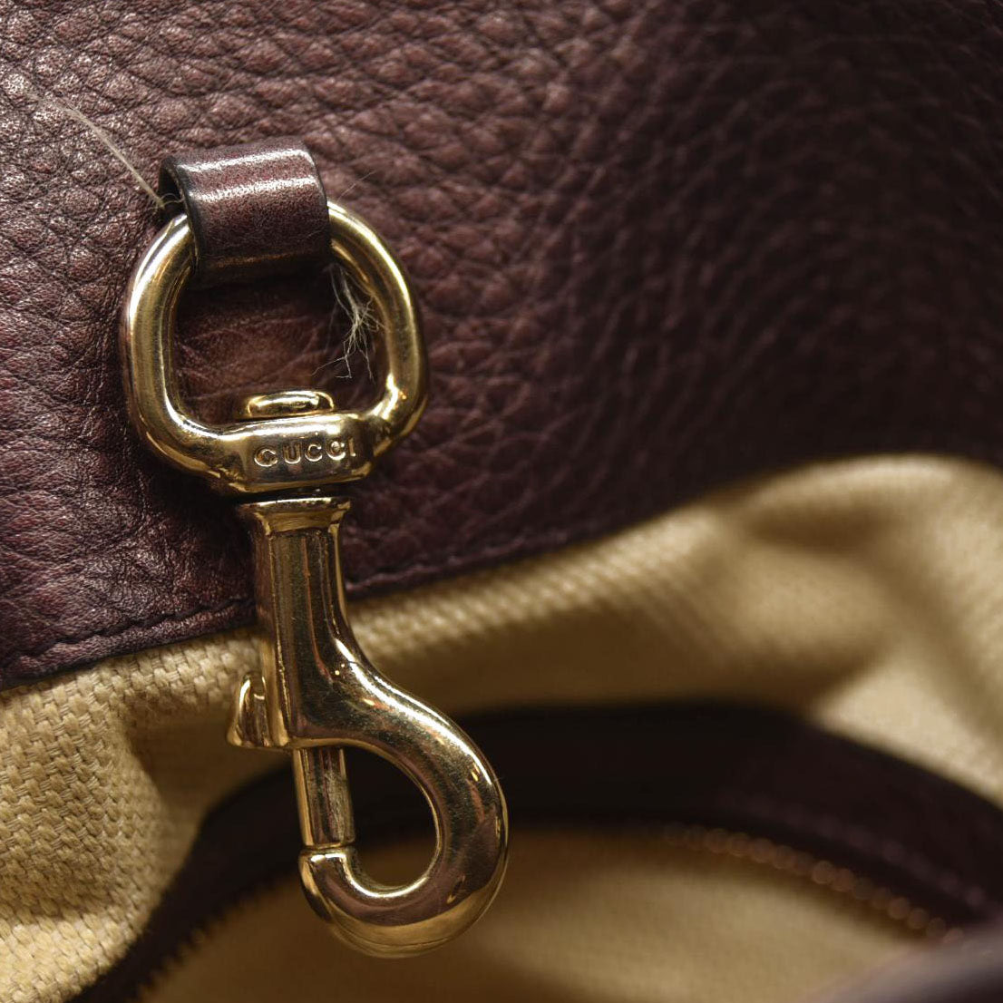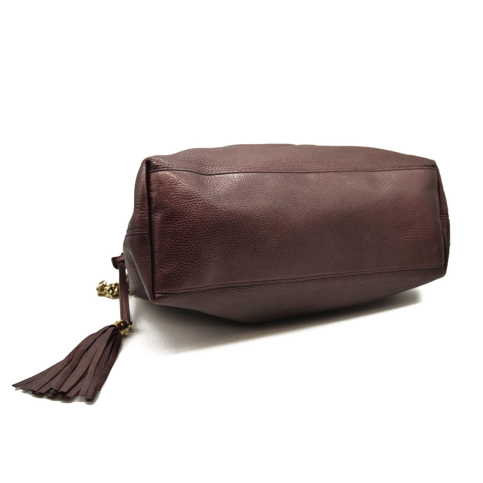 This is an authentic GUCCI Pebbled Calfskin Medium Soho Chain Shoulder Bag in Burgundy. This stylish tote is crafted of richly textured calfskin leather in purple. The bag features a light gold chain link shoulder strap with shoulder pads and a removable tassel, and a prominent Gucci GG logo embossed on the front. The top is open to a coarse linen fabric interior with zipper and patch pockets.