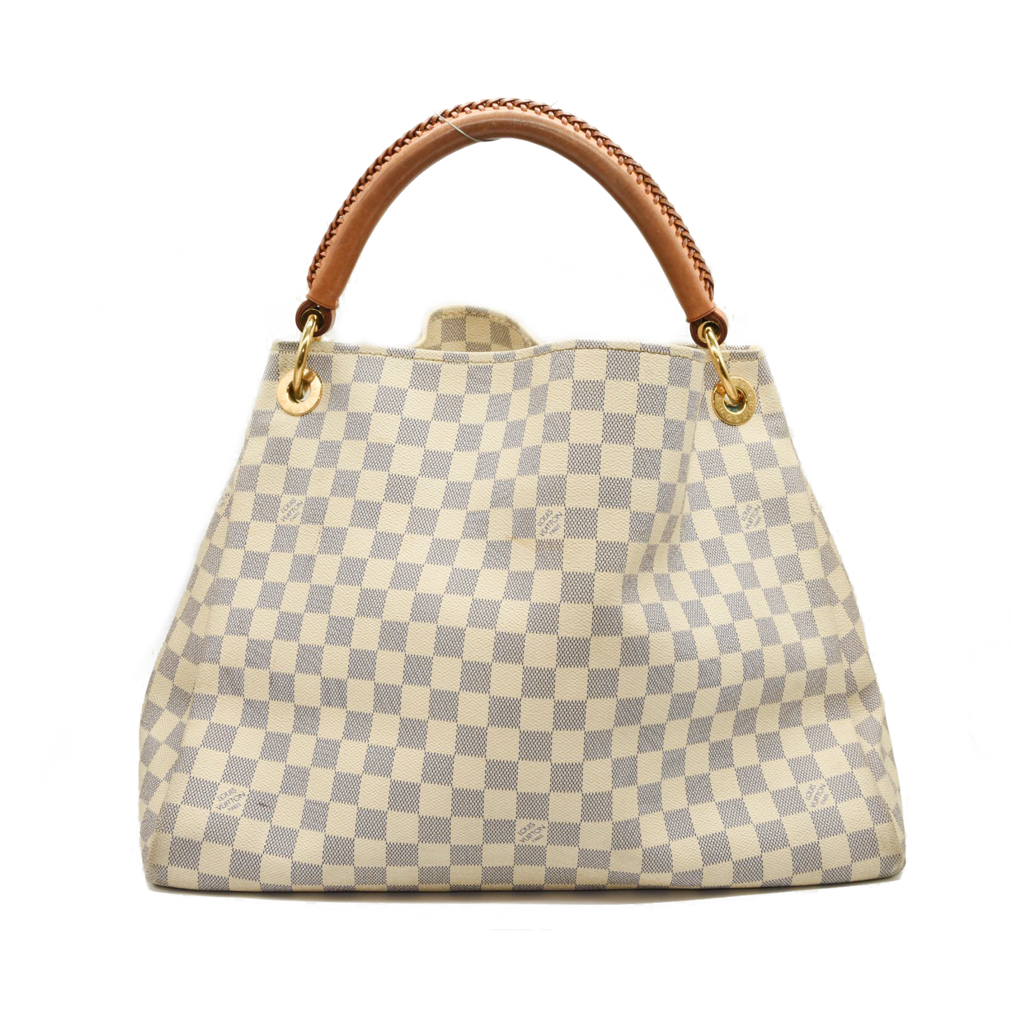 This is an authentic LOUIS VUITTON Damier Azur Artsy MM. This handbag is crafted of signature Louis Vuitton Damier coated canvas in blue and white. The shoulder bag features a looping vachetta handle with woven detail. The top is open to a beige microfiber interior with zipper and patch pockets.