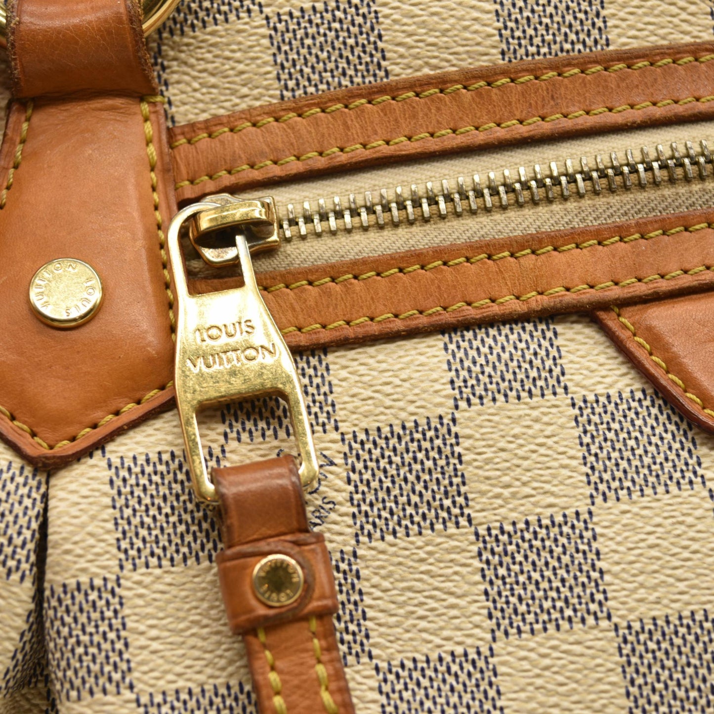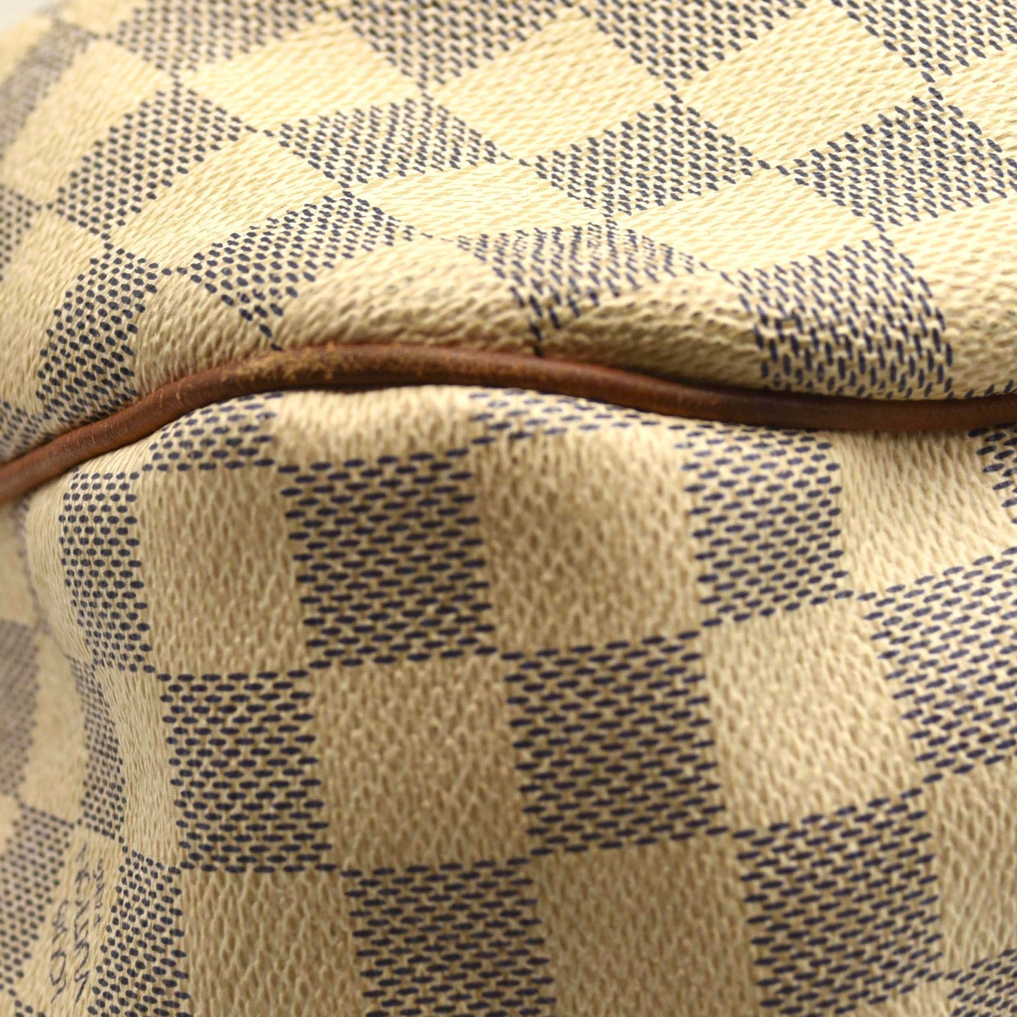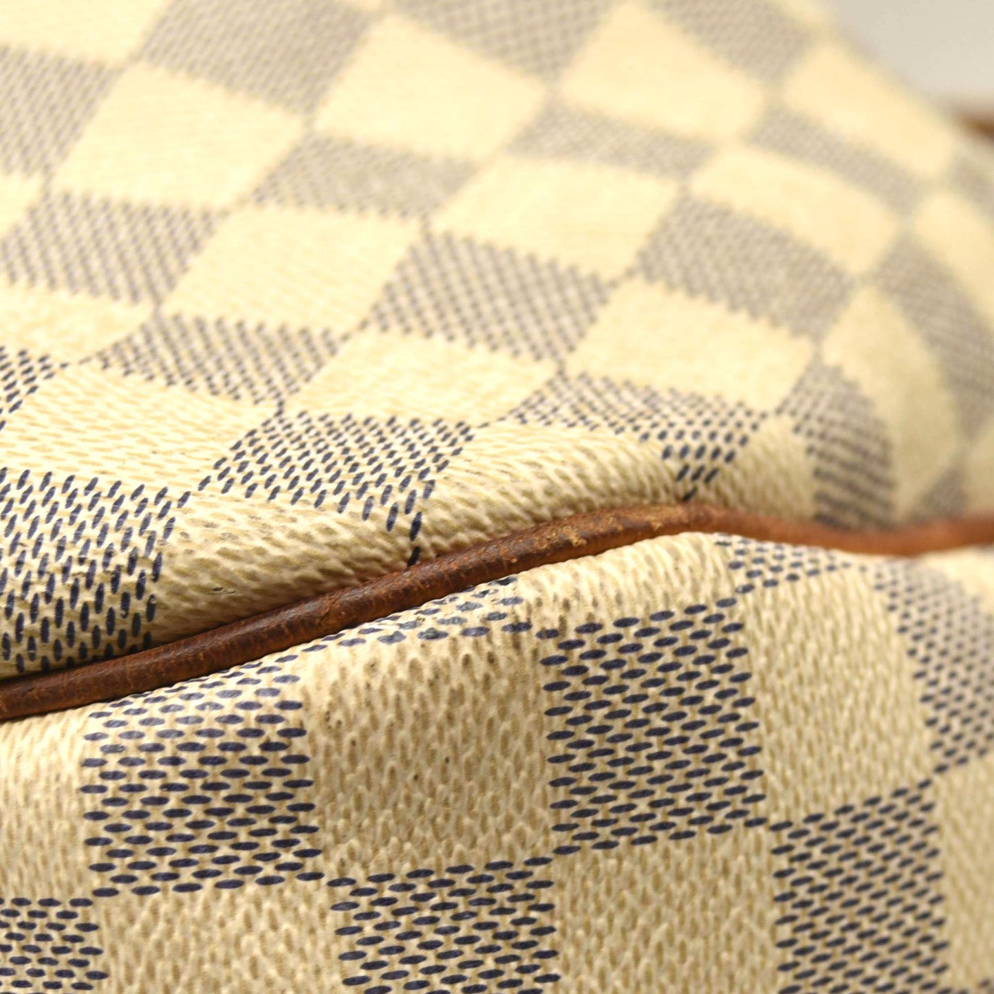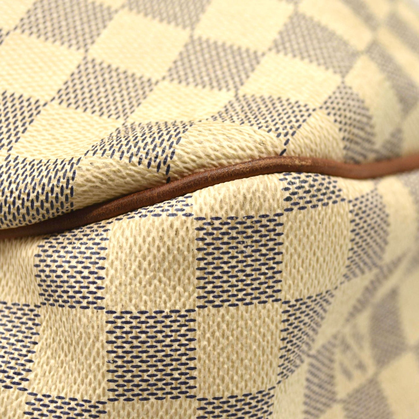 This is an authentic LOUIS VUITTON Damier Azur Evora MM. This handbag is crafted of Louis Vuitton Damier Azur blue and white patterned canvas. The bag features signature vachetta cowhide leather top handles, detachable shoulder strap, a front zipper pocket, and polished gold hardware. The gold top zipper opens to an ivory colored microfiber interior with patch pockets.