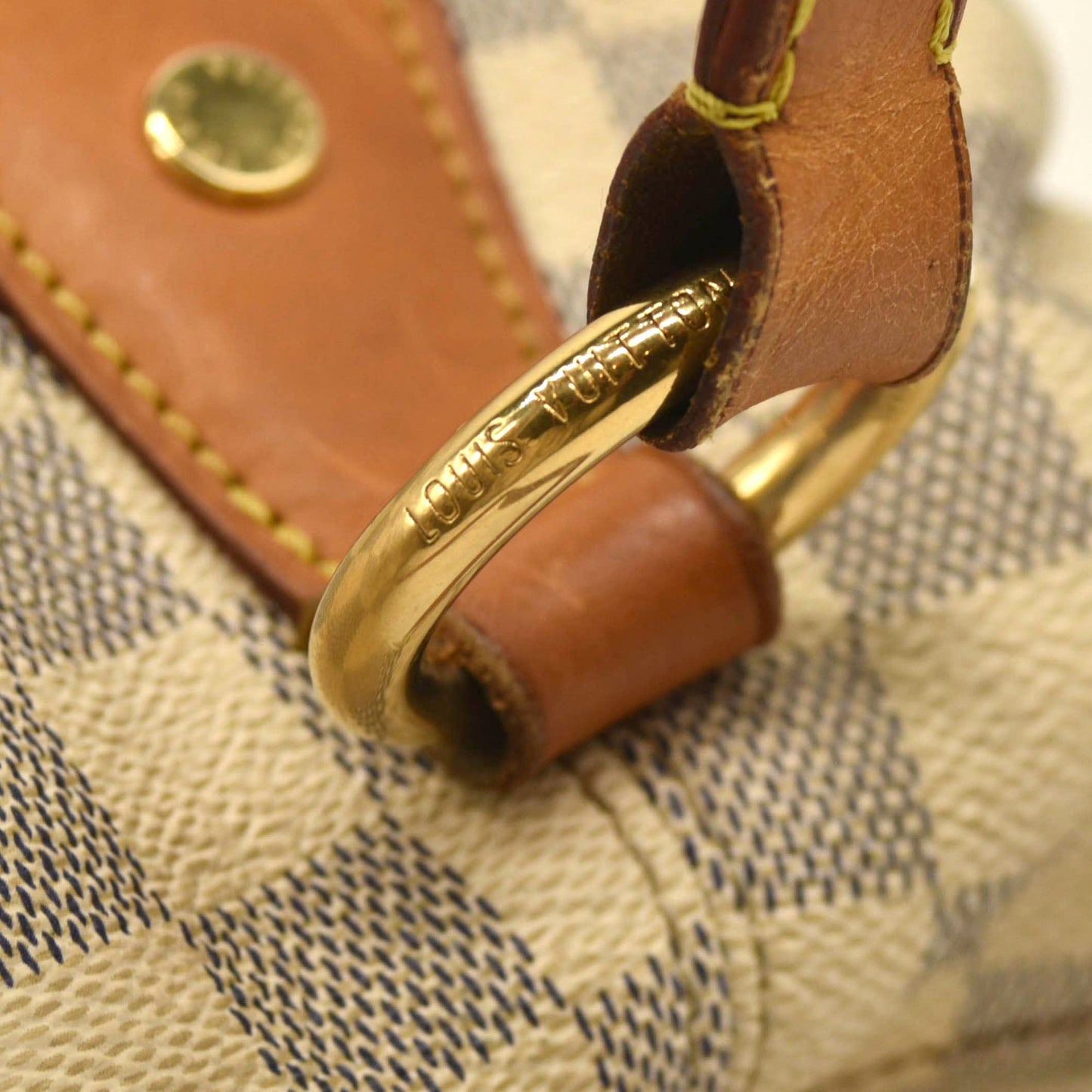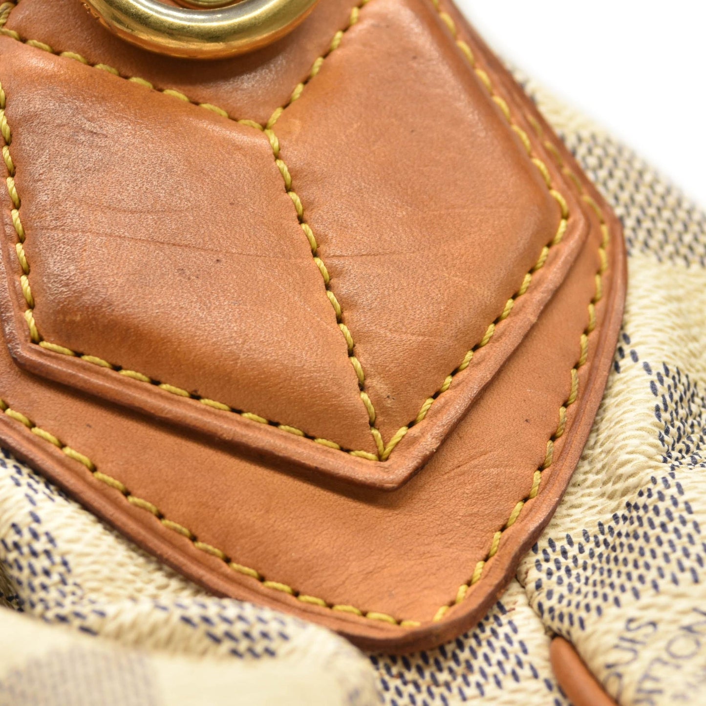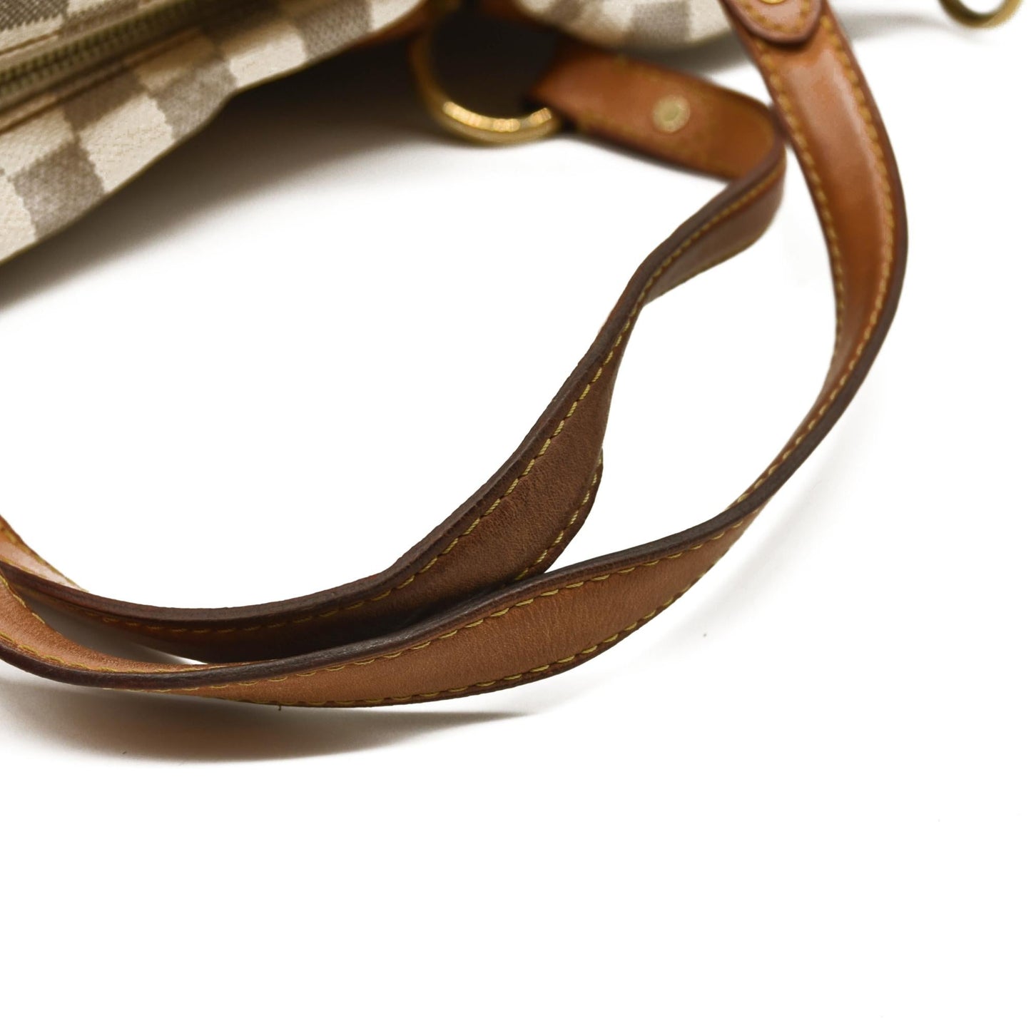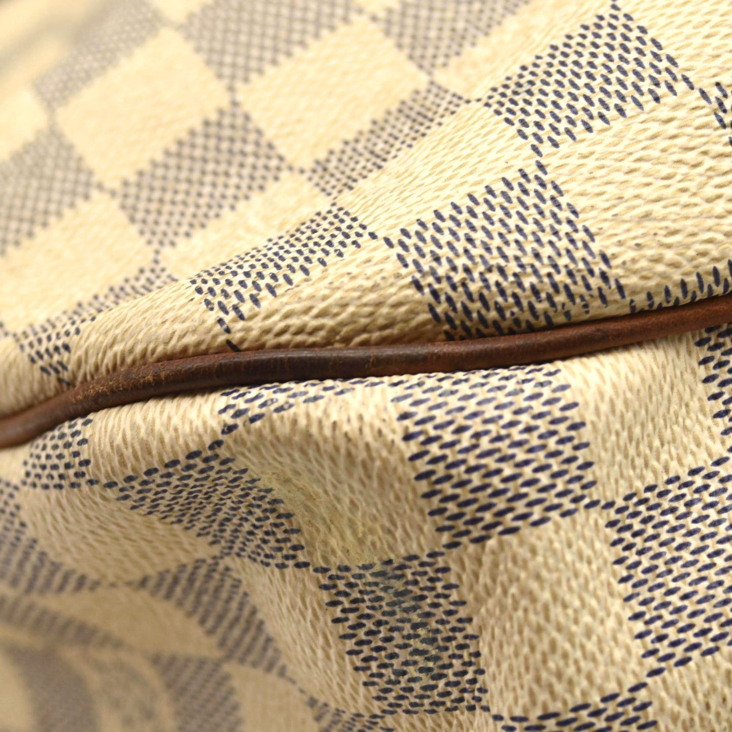 This is an authentic LOUIS VUITTON Damier Azur Evora MM. This handbag is crafted of Louis Vuitton Damier Azur blue and white patterned canvas. The bag features signature vachetta cowhide leather top handles, detachable shoulder strap, a front zipper pocket, and polished gold hardware. The gold top zipper opens to an ivory colored microfiber interior with patch pockets.