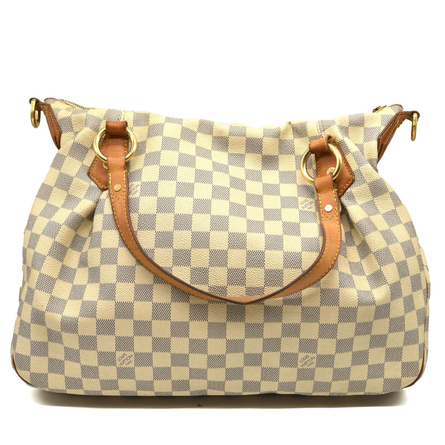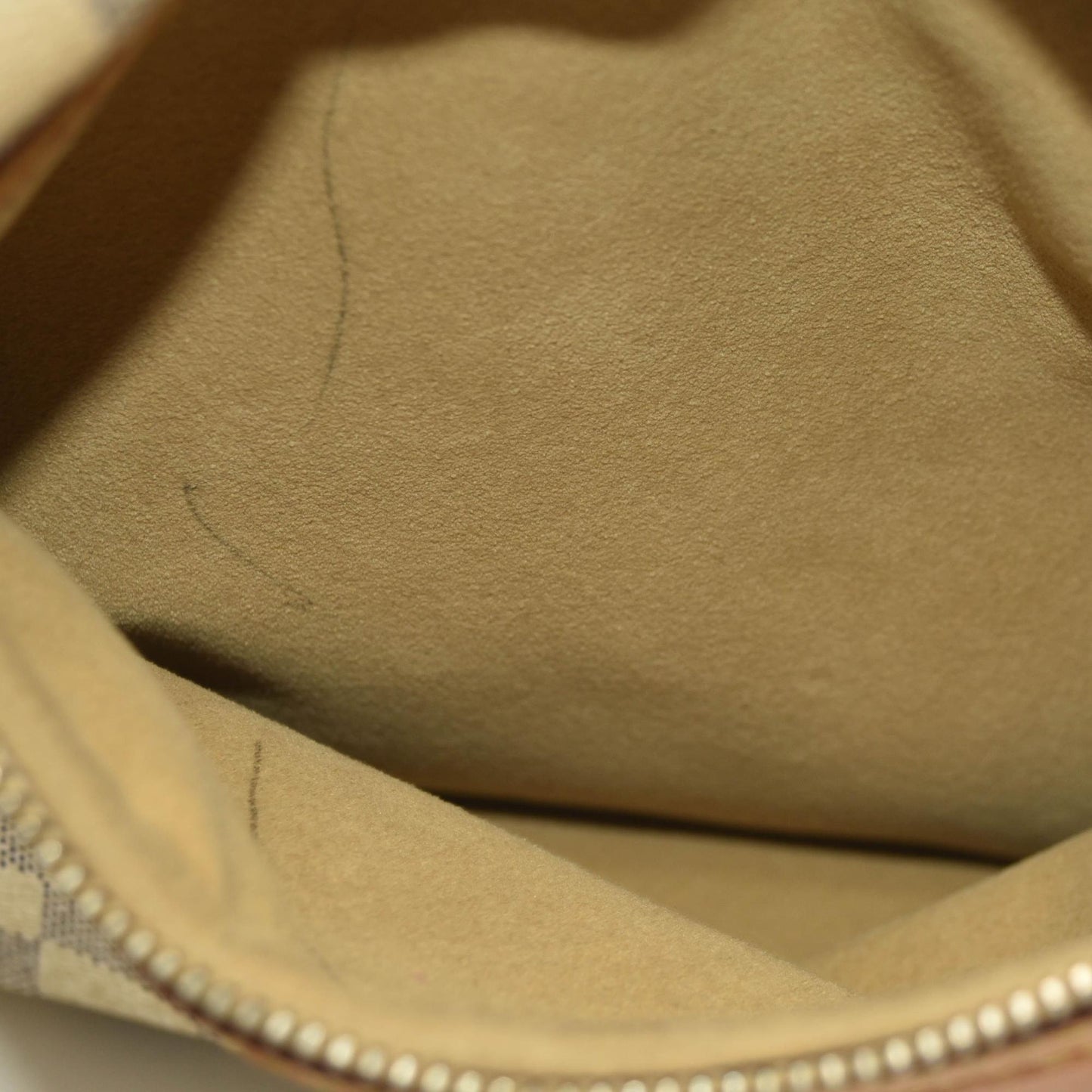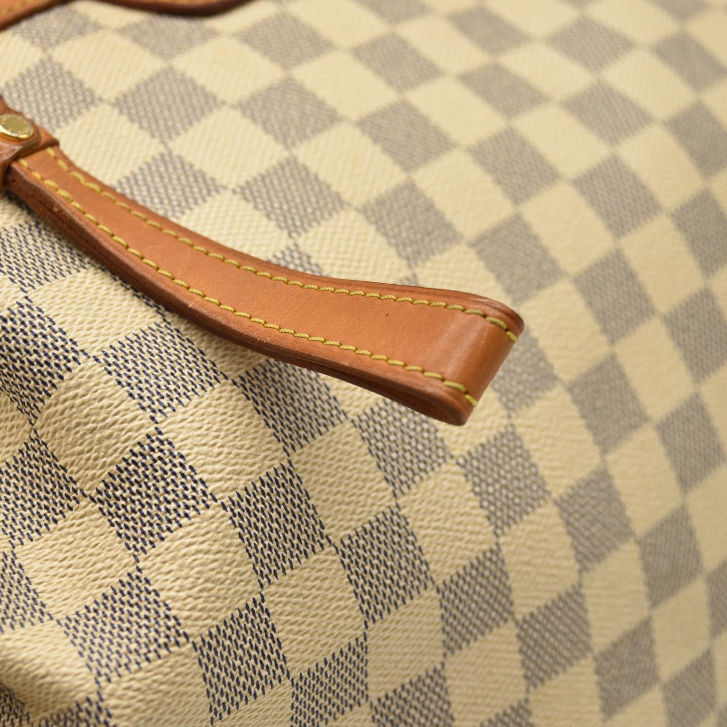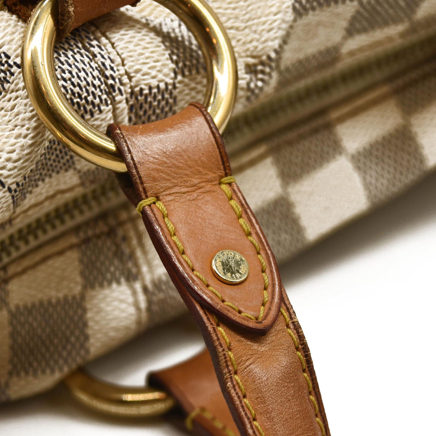 This is an authentic LOUIS VUITTON Damier Azur Evora MM. This handbag is crafted of Louis Vuitton Damier Azur blue and white patterned canvas. The bag features signature vachetta cowhide leather top handles, detachable shoulder strap, a front zipper pocket, and polished gold hardware. The gold top zipper opens to an ivory colored microfiber interior with patch pockets.