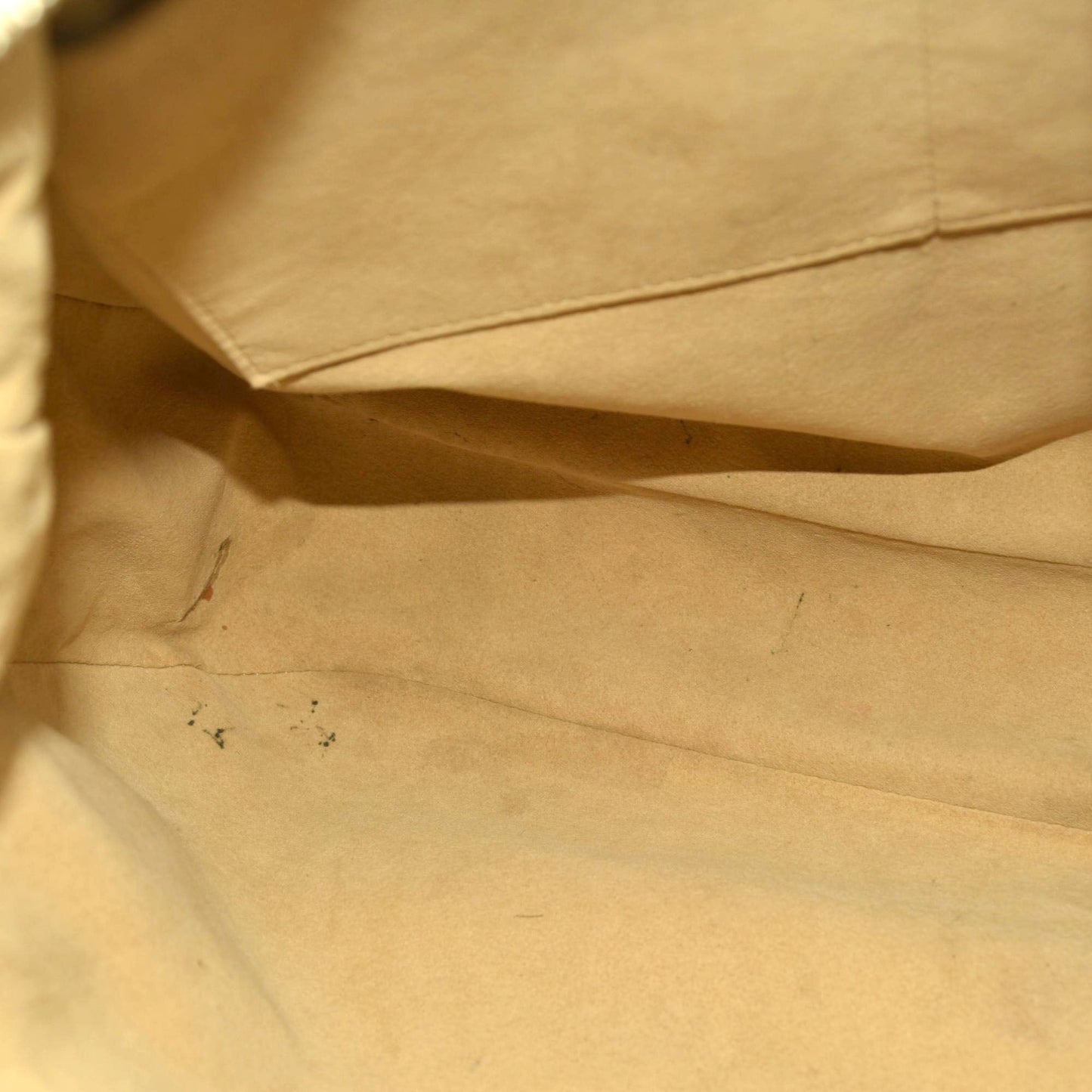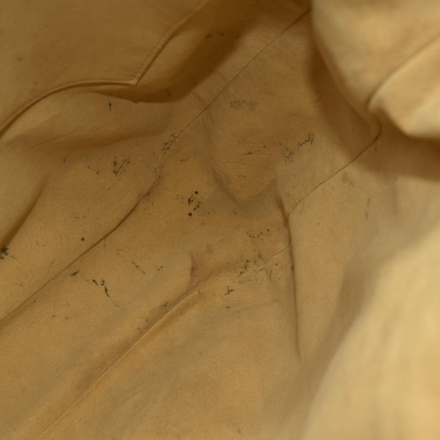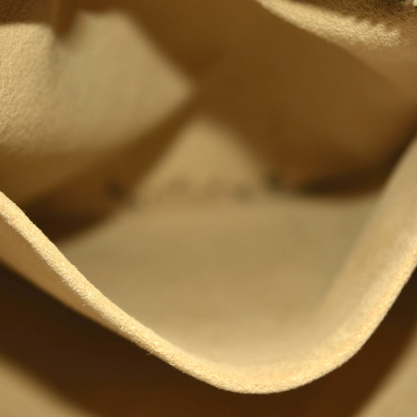 Handle: Creases, scuffs, wear at resin glazing, darkening, patina of vachetta, liquid marks, freying