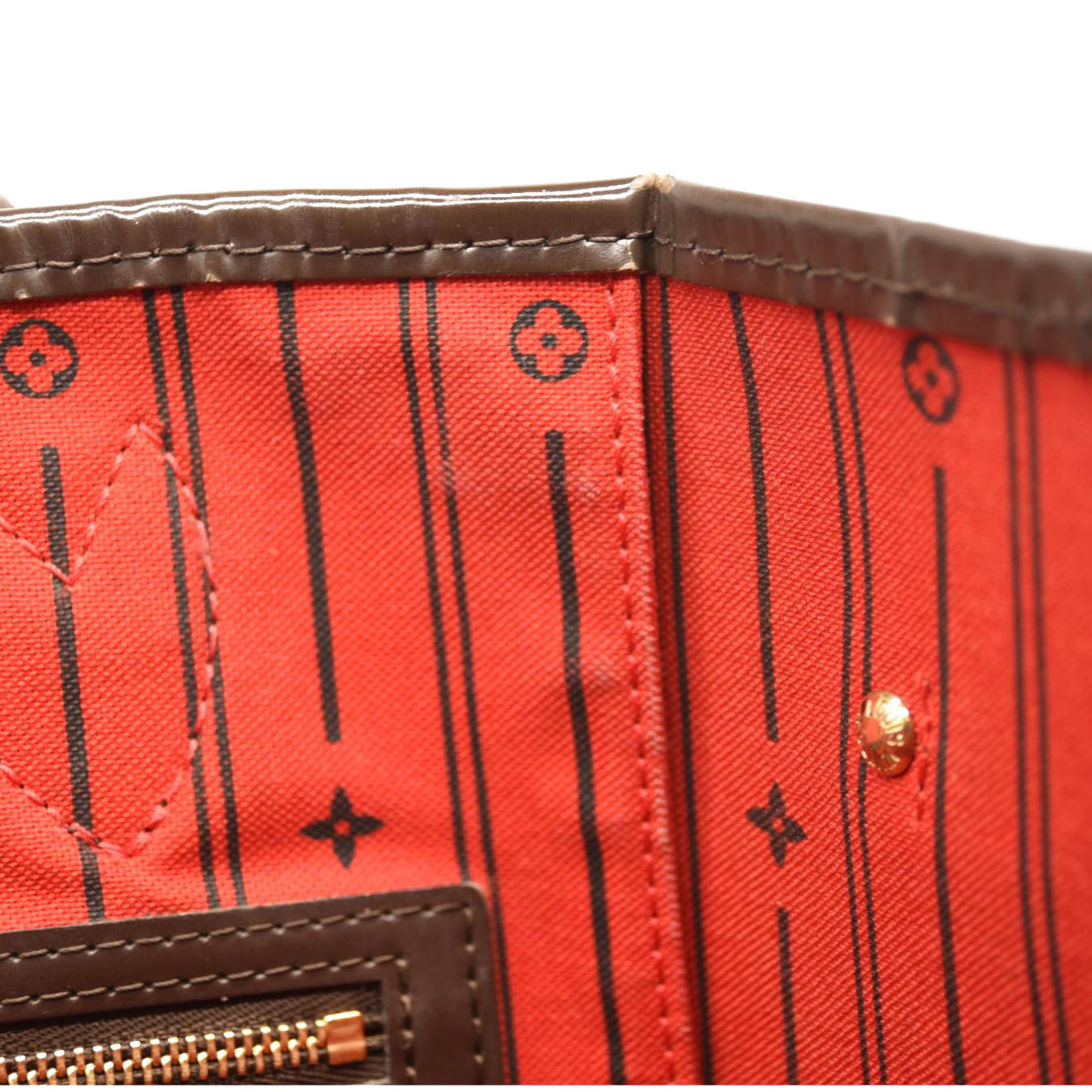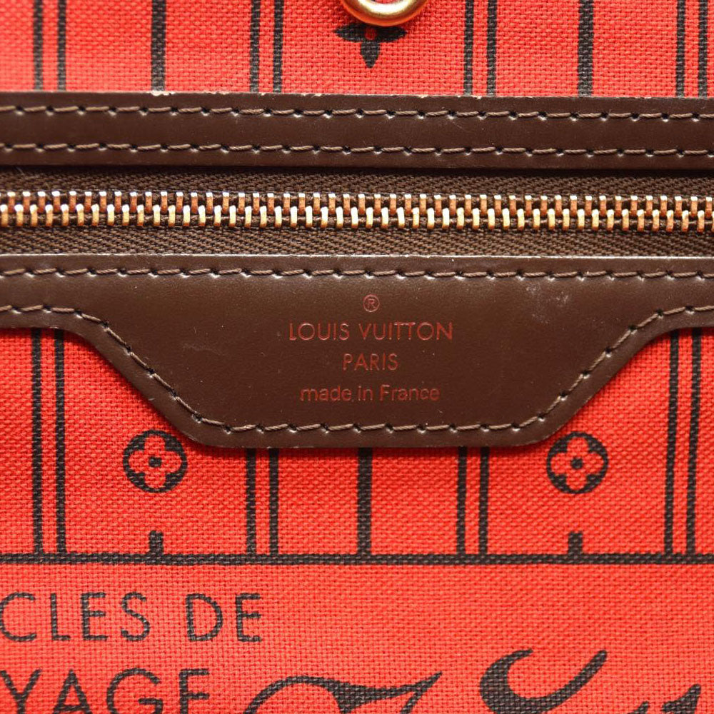 This is an authentic LOUIS VUITTON Damier Ebene Neverfull GM. This chic handbag is crafted of classic Louis Vuitton damier checkered canvas with chocolate brown cowhide leather top shoulder handles and trim. This bag opens to an interior of rouge red striped Louis Vuitton logo fabric with a zipper pocket. This is a wonderful tote that is ideal for all of your everyday needs with the special accent of luxury and style, from Louis Vuitton.
