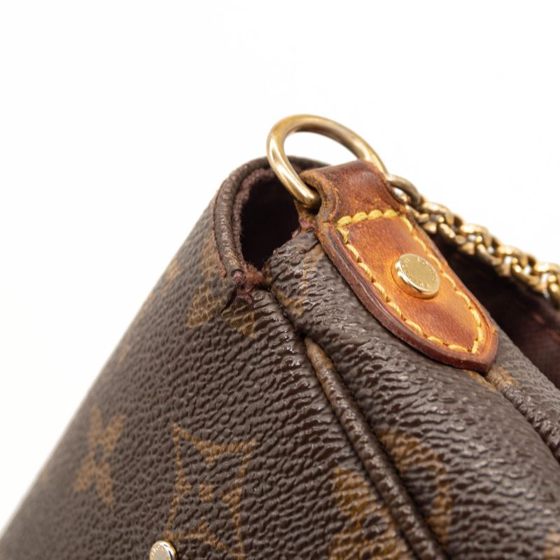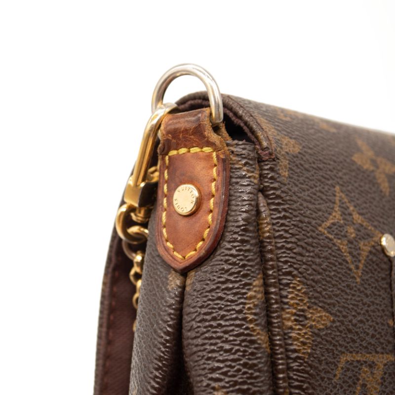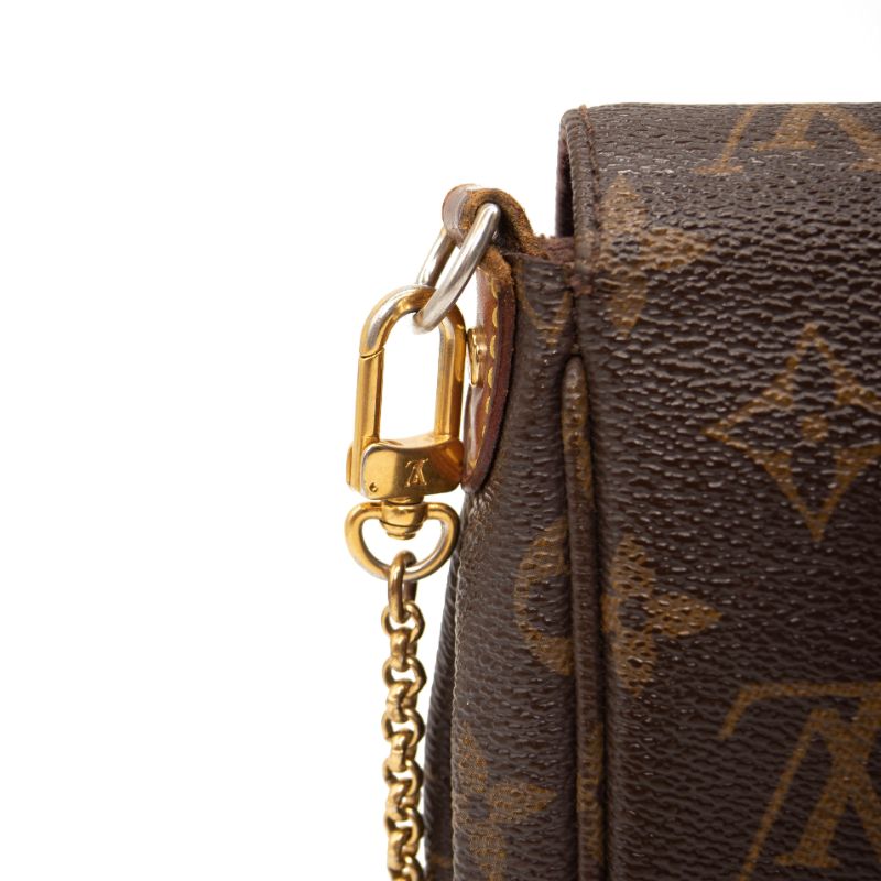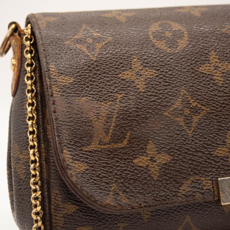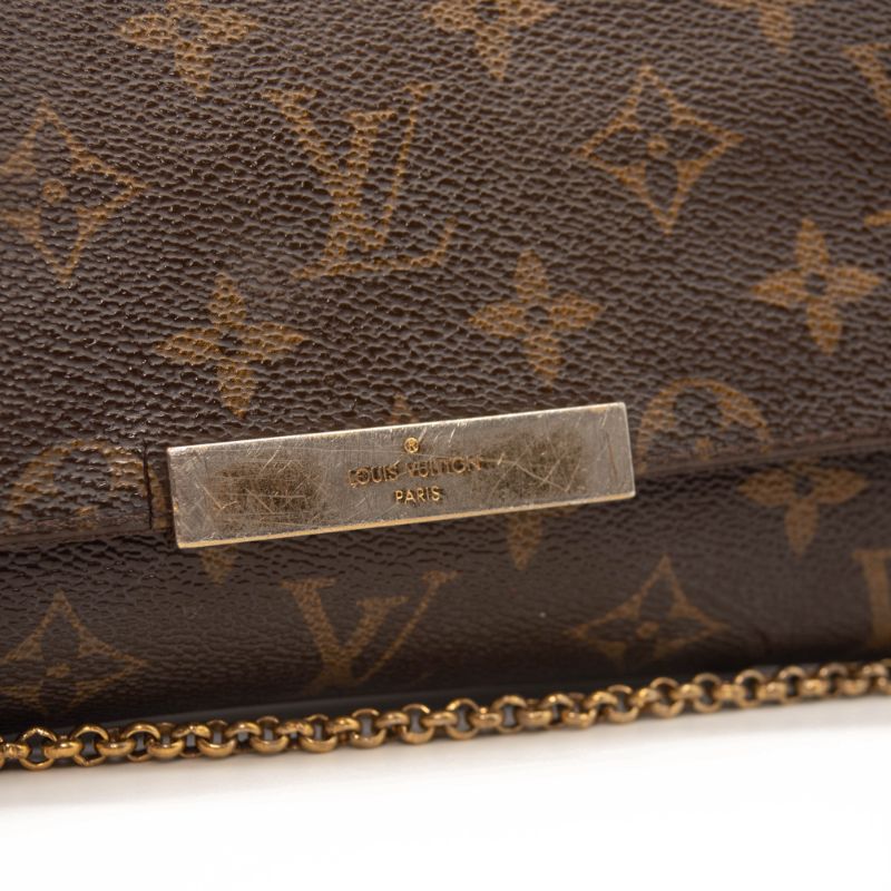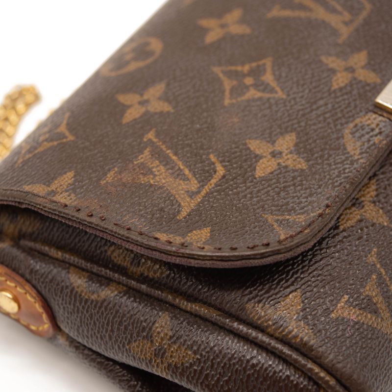We guarantee this is an authentic LOUIS VUITTON Monogram Favorite PM or 100% of your money back. This stylish bag is crafted of a durable monogram toile canvas with a polished brass chain strap and an optional vachetta leather shoulder strap. The crossover flap opens with a magnetic brass bar to a purple fabric interior with a patch pocket.