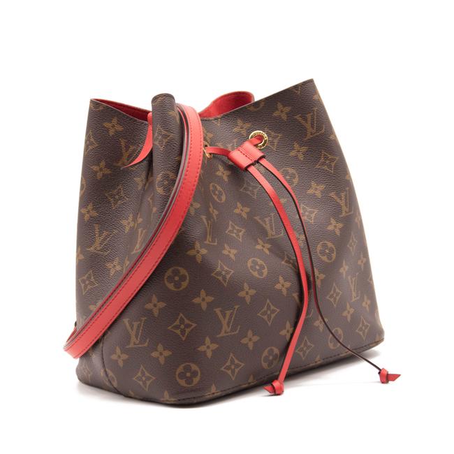 This is an authentic LOUIS VUITTON Monogram Neonoe MM in Coquelicot. This classic shoulder bag is crafted of a Louis Vuitton monogram on coated canvas in brown. The bag features a red leather shoulder strap and a top cinch strap with polished brass hardware. This opens to a partitioned red microfiber interior with a middle zipper compartment.