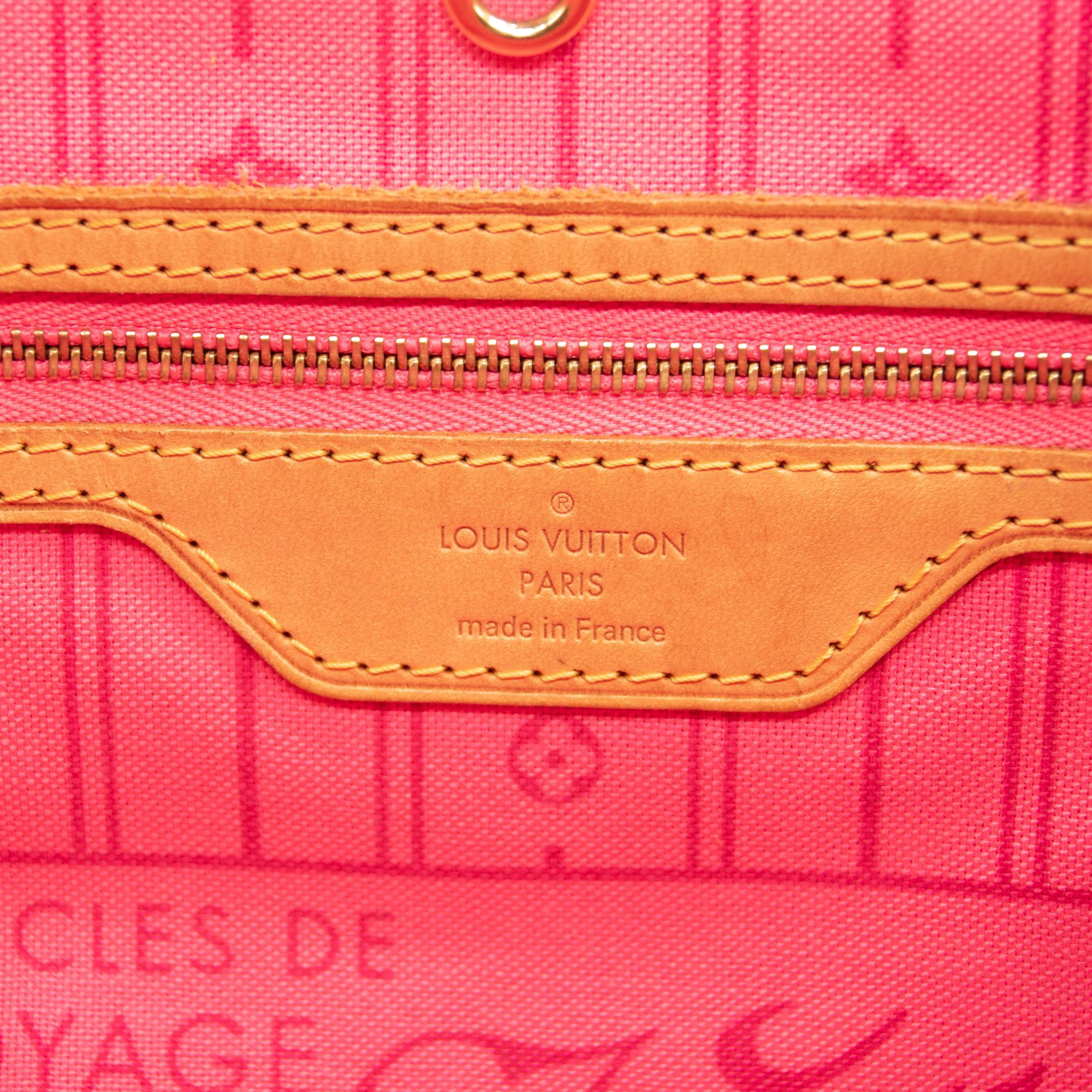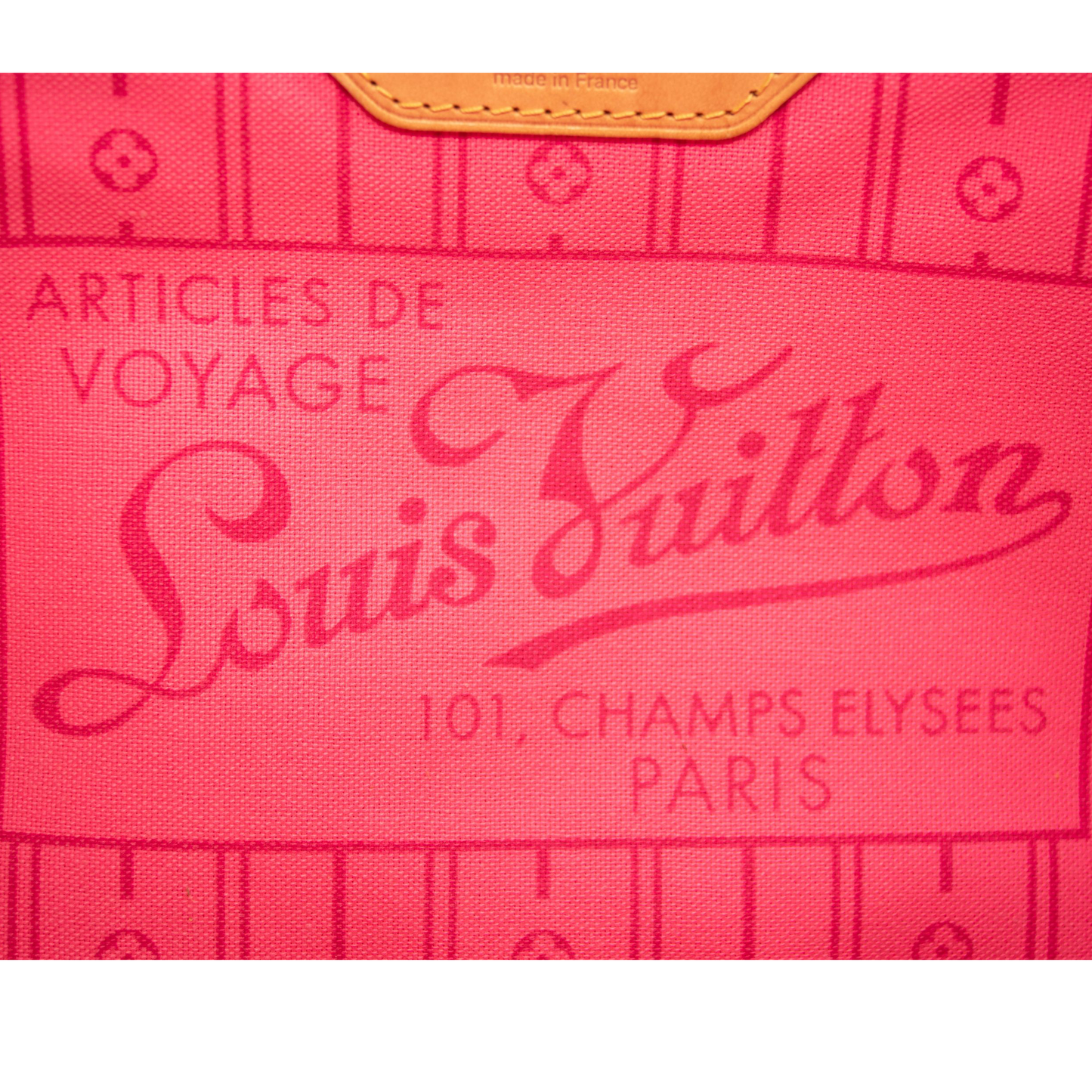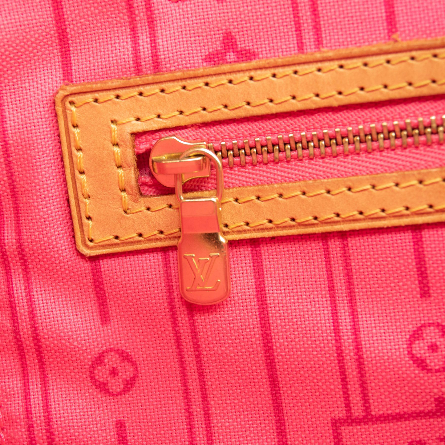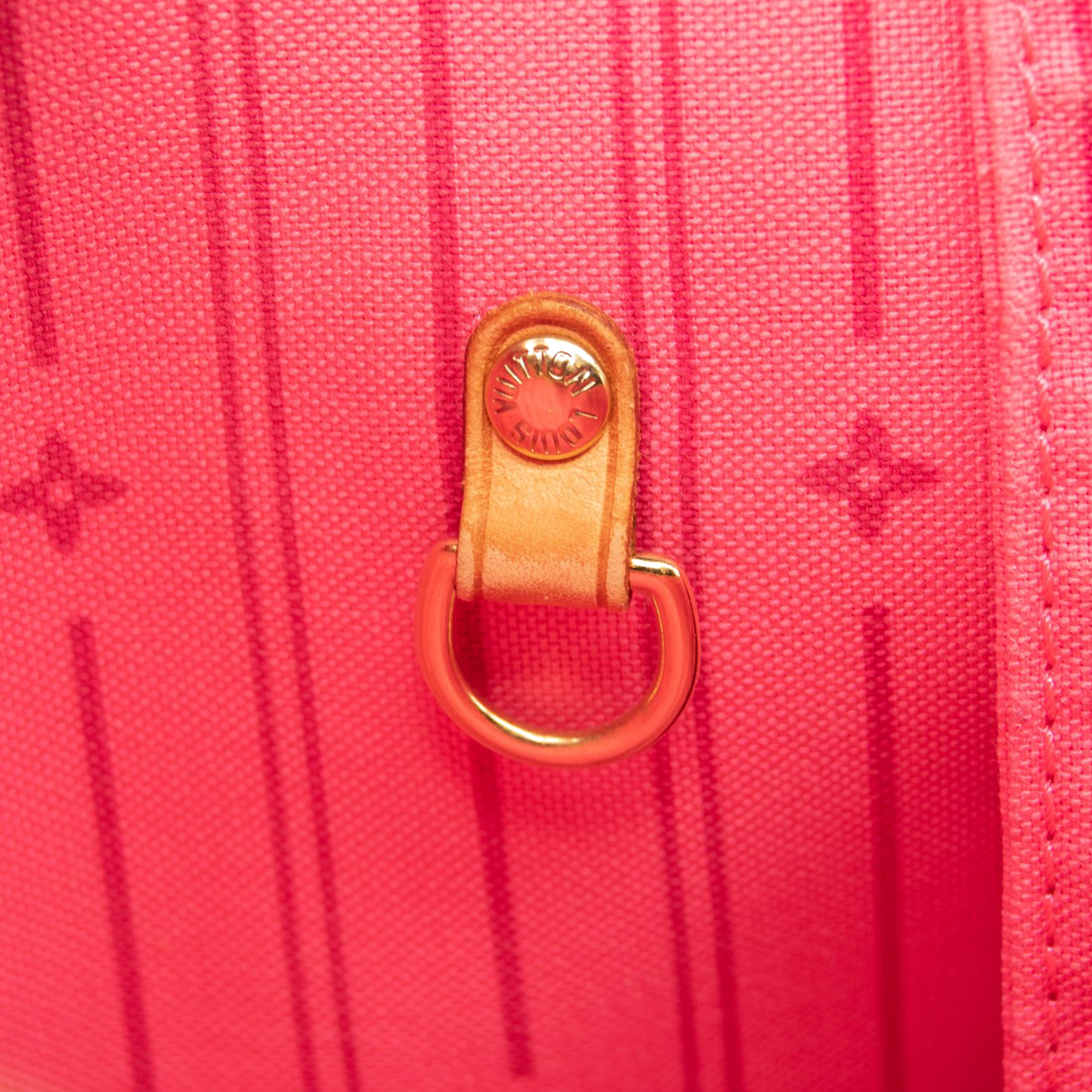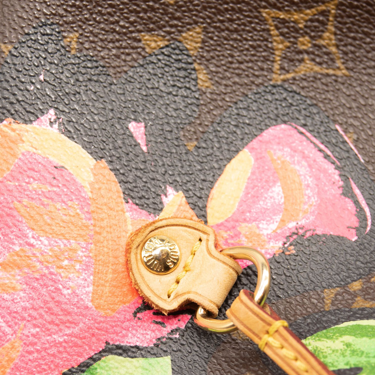 This is an authentic LOUIS VUITTON Monogram Roses Neverfull MM. This beautiful tote is crafted of classic Louis Vuitton monogram coated canvas, with a painted bright pink and orange, rose print overlay. The bag features vachetta cowhide leather trim, handles, and side cinch cords with polished brass hardware. The top is open to a striped vibrant pink fabric interior with a zipper pocket.