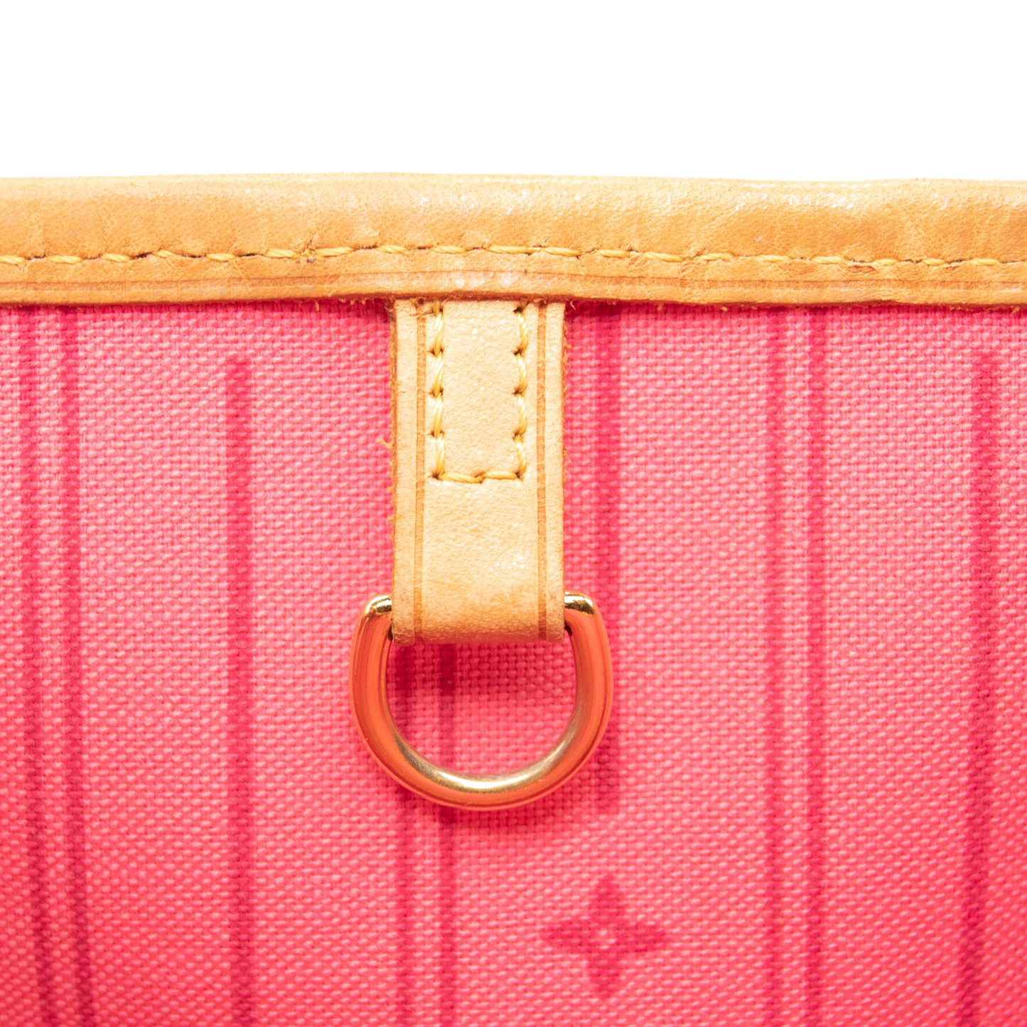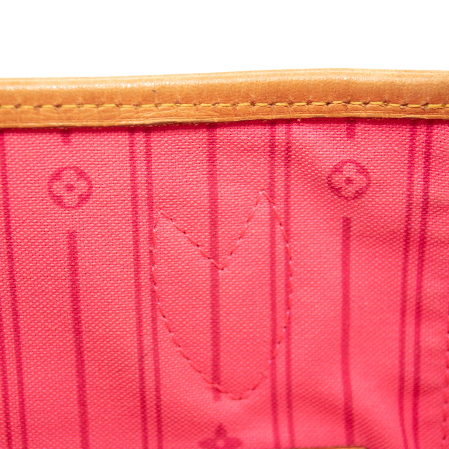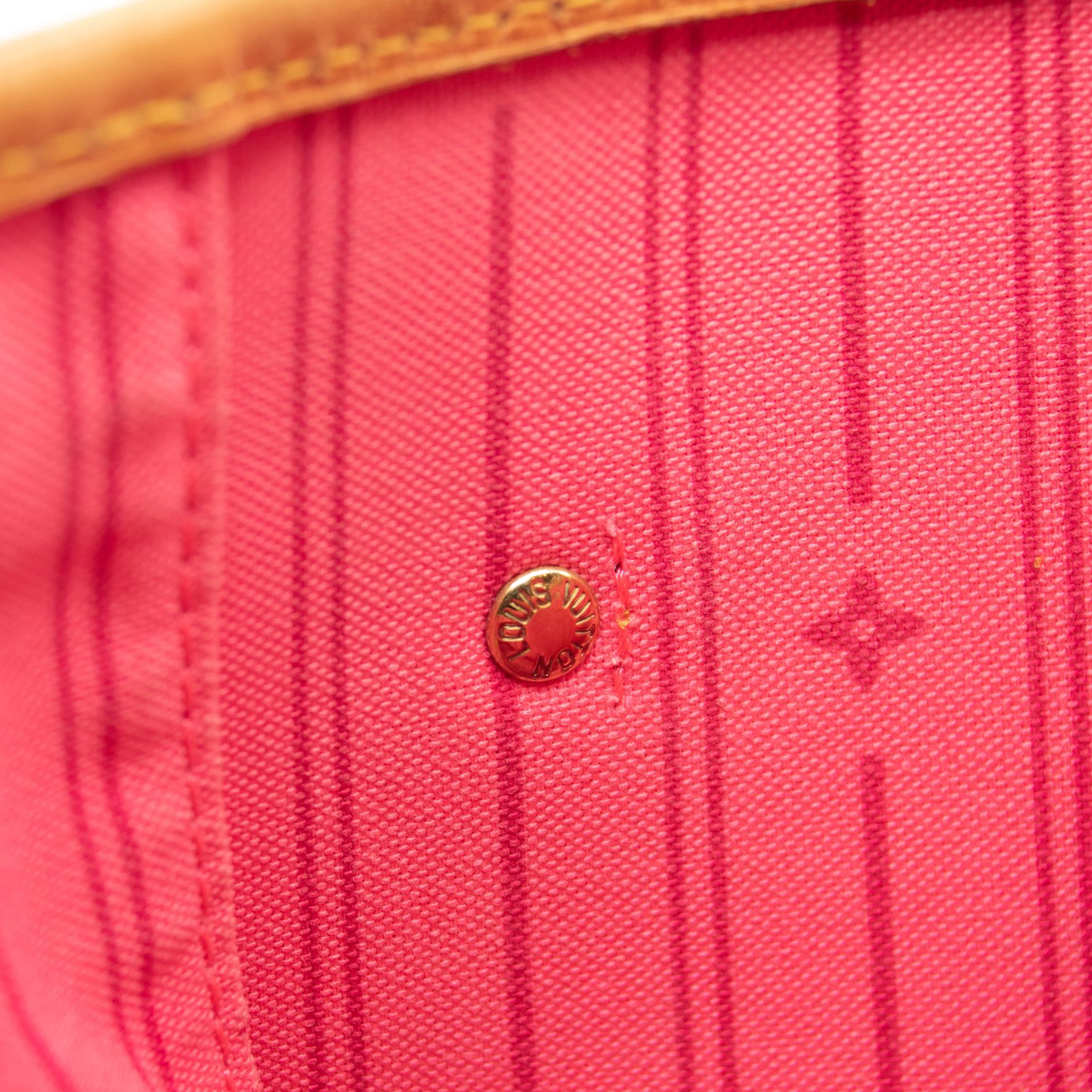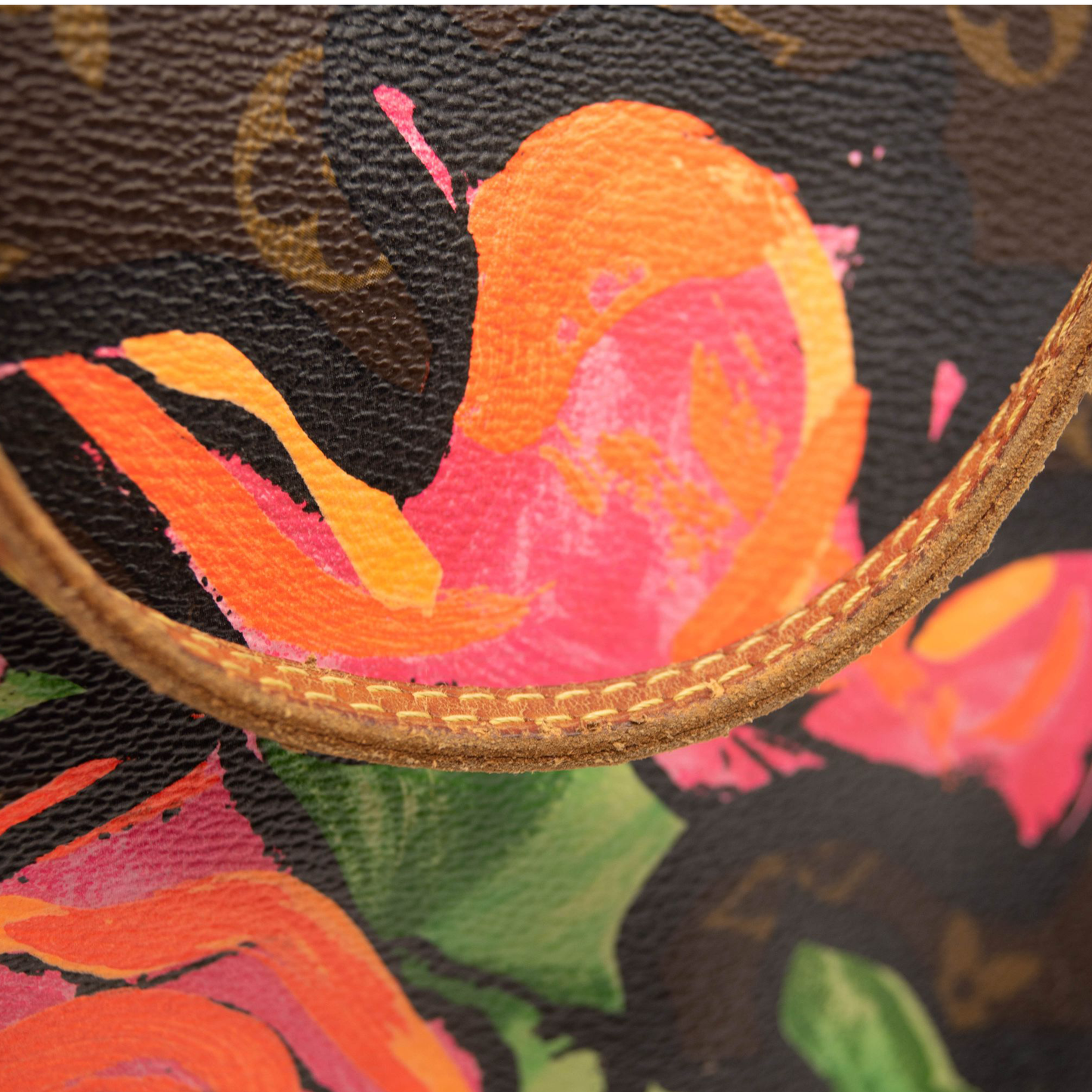 This is an authentic LOUIS VUITTON Monogram Roses Neverfull MM. This beautiful tote is crafted of classic Louis Vuitton monogram coated canvas, with a painted bright pink and orange, rose print overlay. The bag features vachetta cowhide leather trim, handles, and side cinch cords with polished brass hardware. The top is open to a striped vibrant pink fabric interior with a zipper pocket.