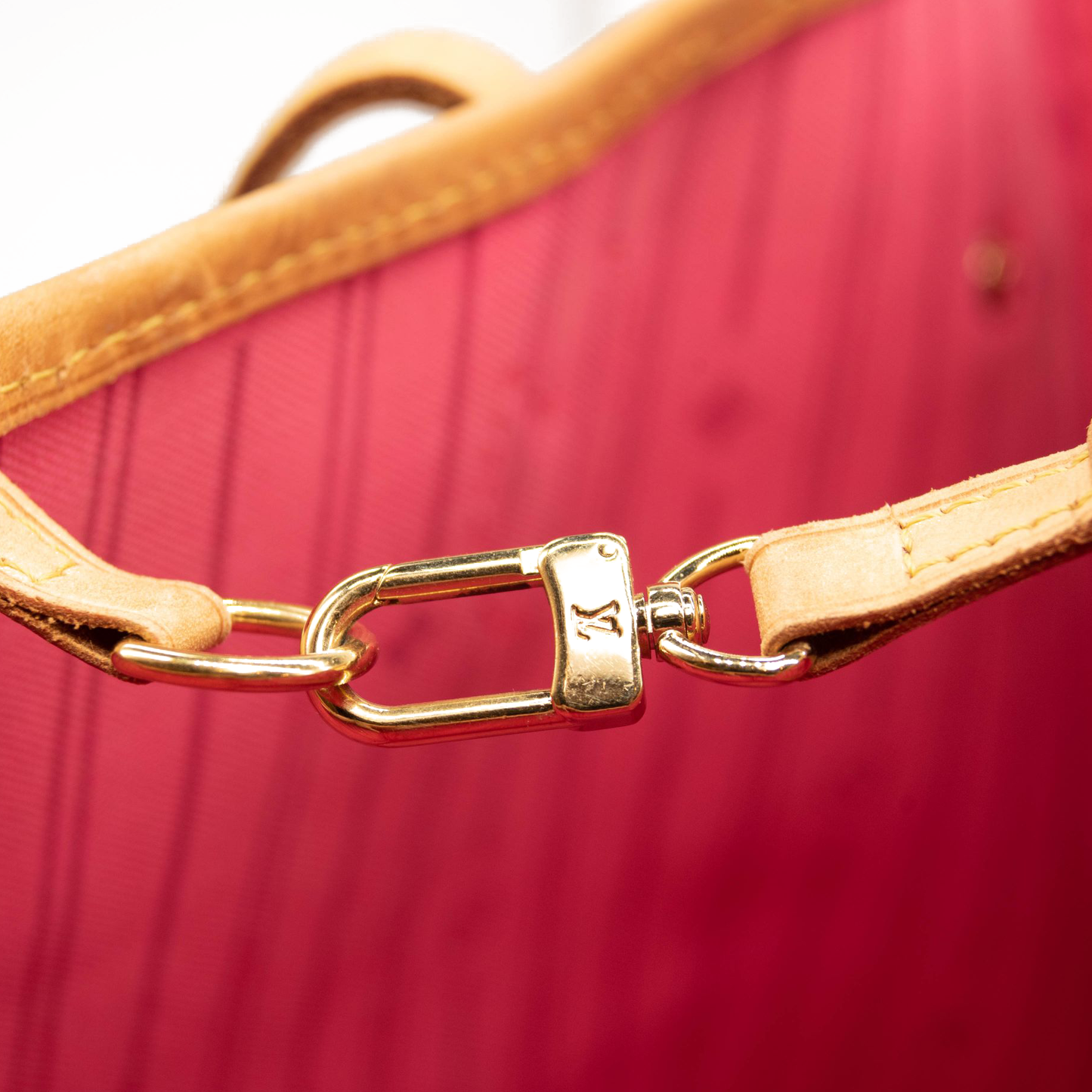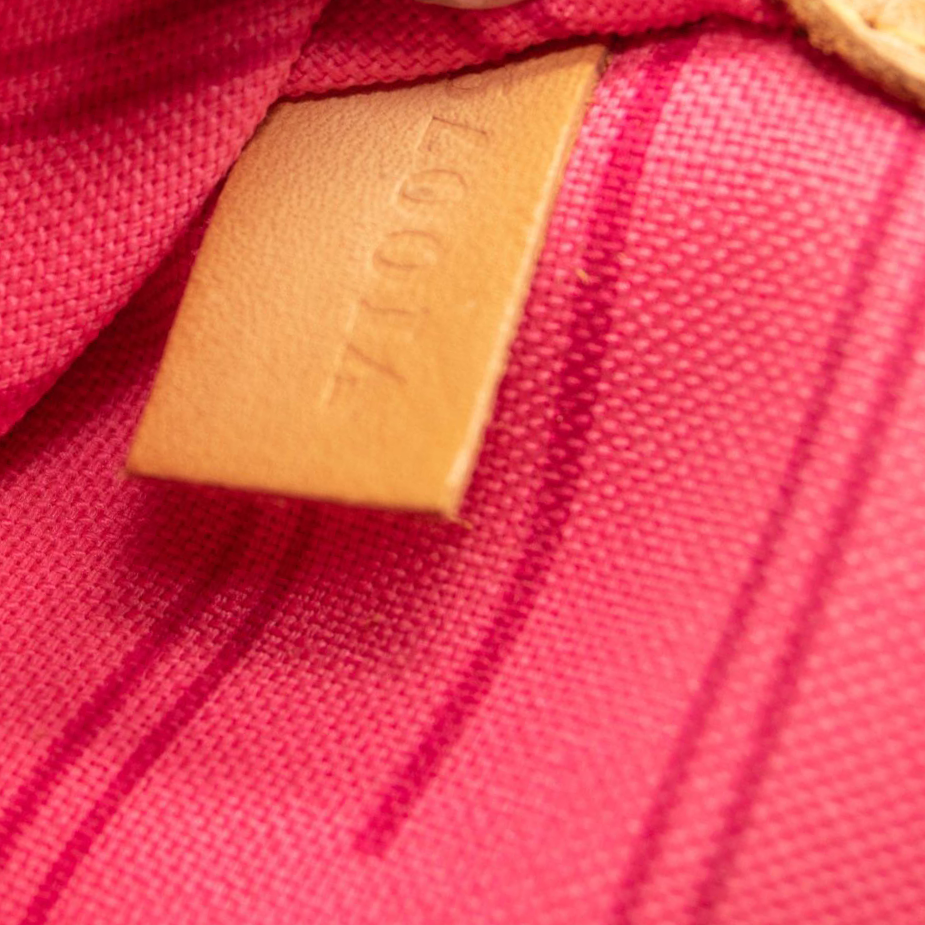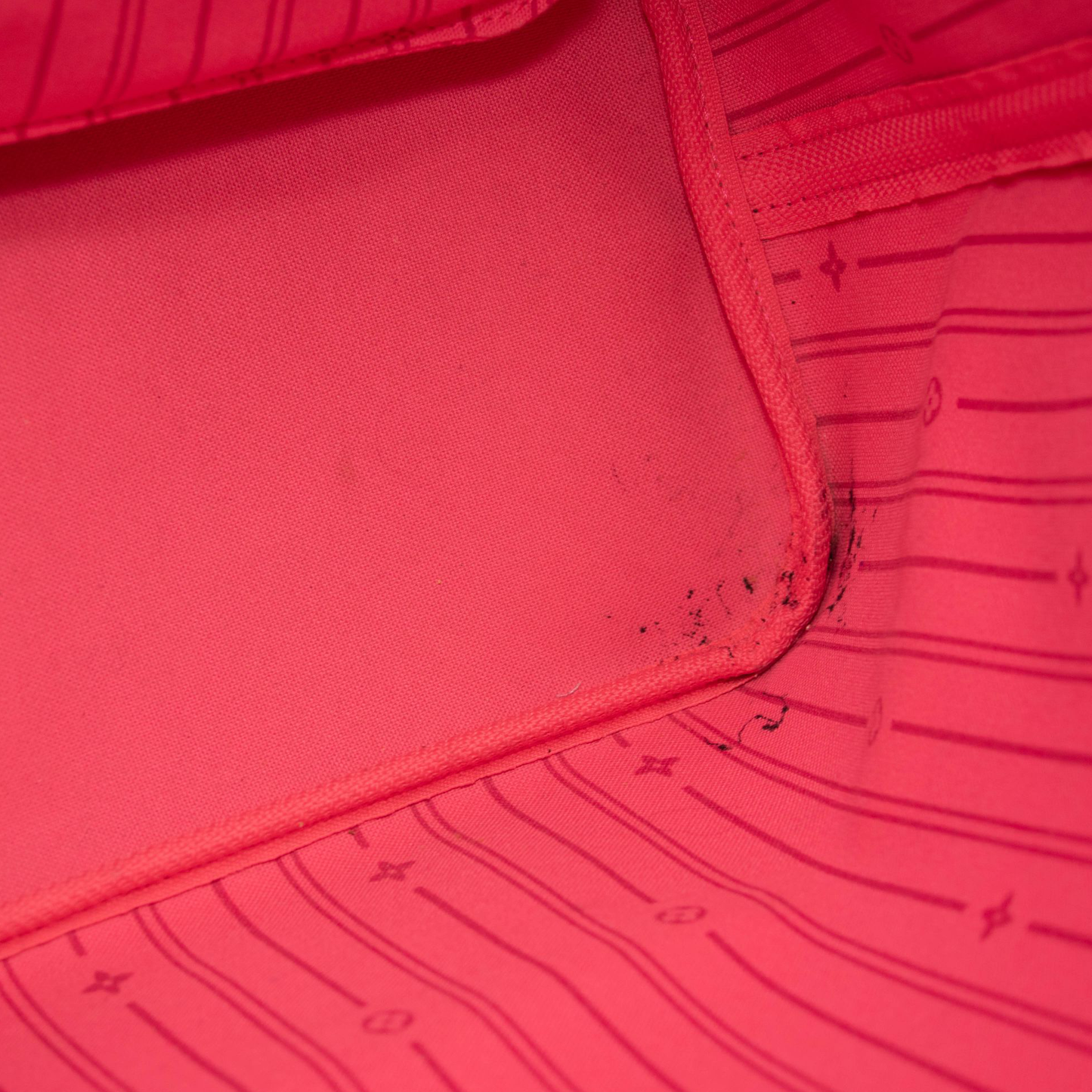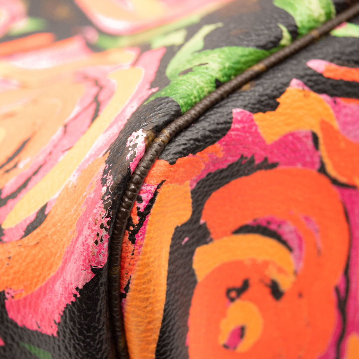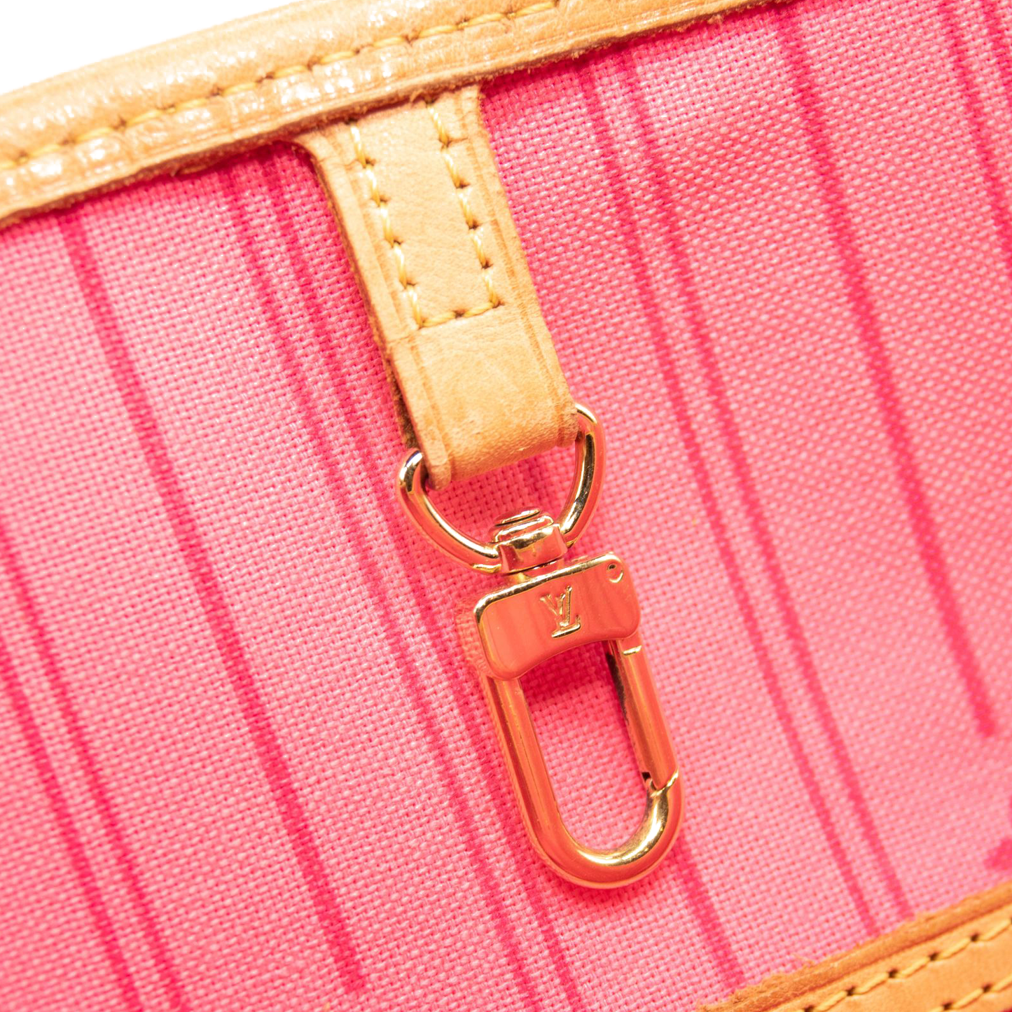 This is an authentic LOUIS VUITTON Monogram Roses Neverfull MM. This beautiful tote is crafted of classic Louis Vuitton monogram coated canvas, with a painted bright pink and orange, rose print overlay. The bag features vachetta cowhide leather trim, handles, and side cinch cords with polished brass hardware. The top is open to a striped vibrant pink fabric interior with a zipper pocket.
